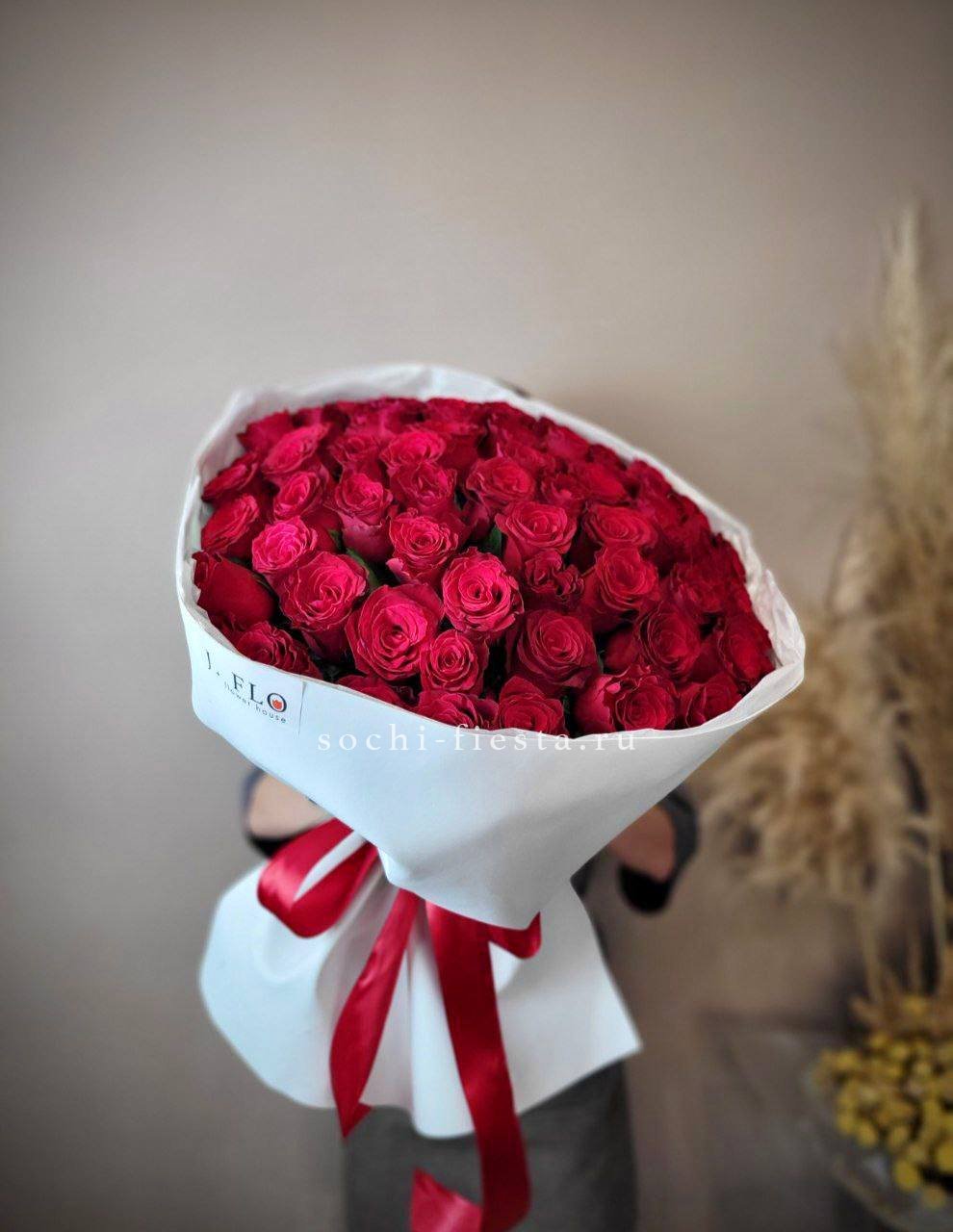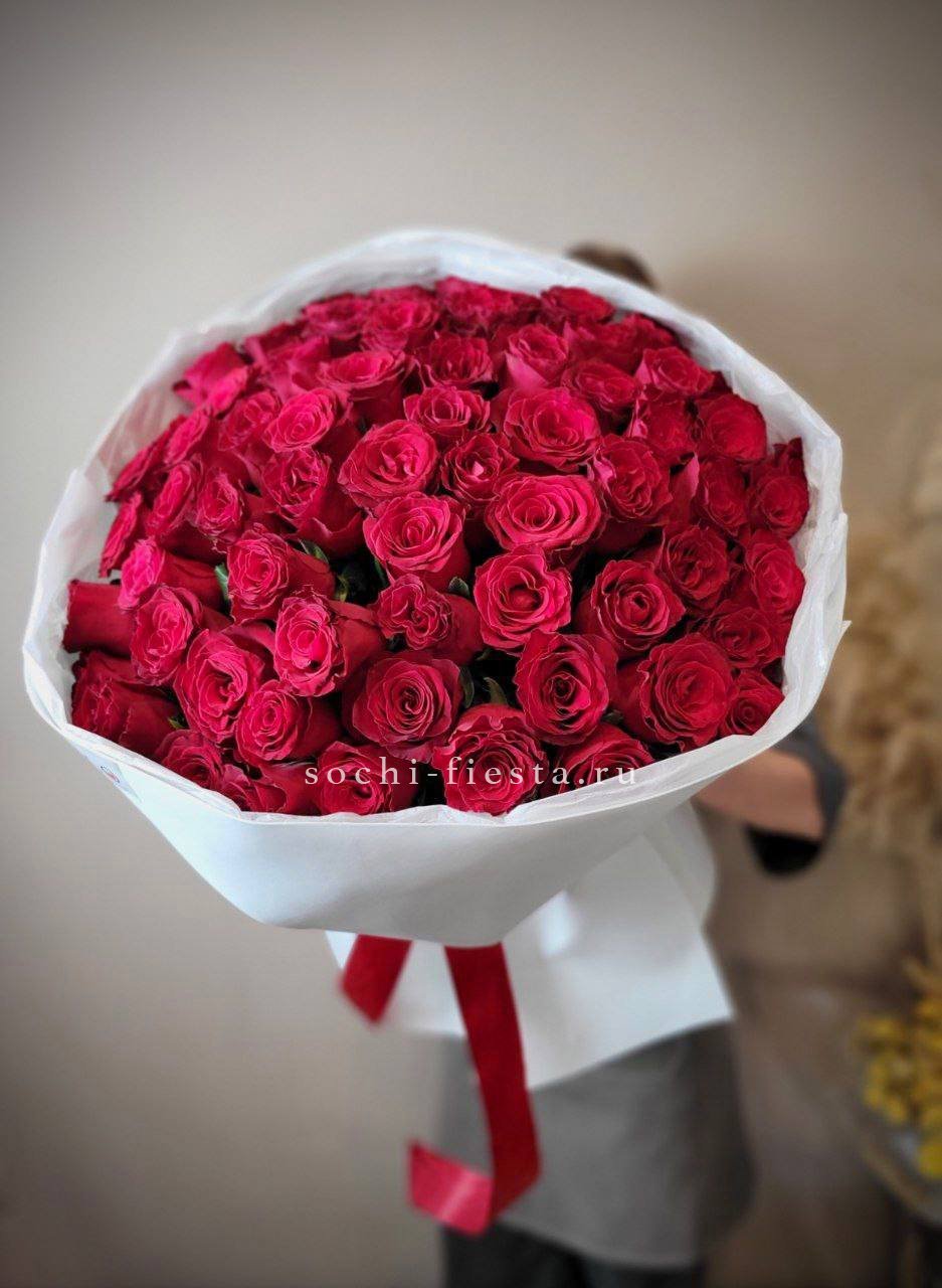 Насыщенный алый цвет роз традиционно ассоциируется с глубокой страстью, сильной любовью и восхищением. Такой подарок несет в себе мощный эмоциональный посыл и предназначен для создания драматического и торжественного эффекта.