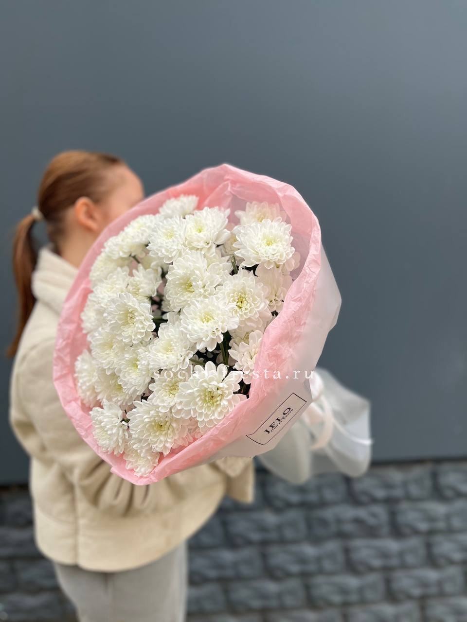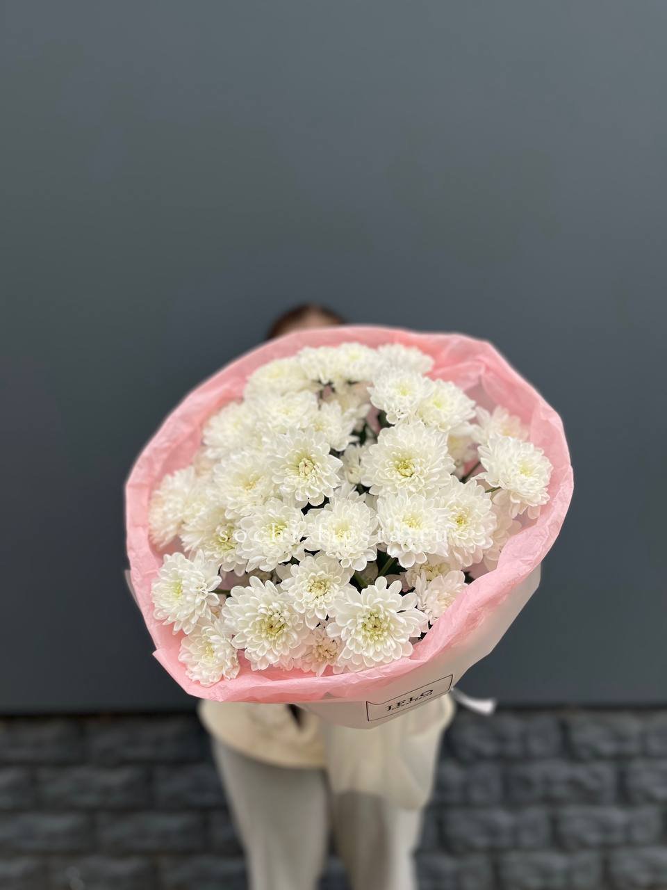 Пять кустовых хризантем собраны в лаконичный букет с мягким обрамлением. Пышные соцветия создают воздушный объем и заполняют пространство легкостью.