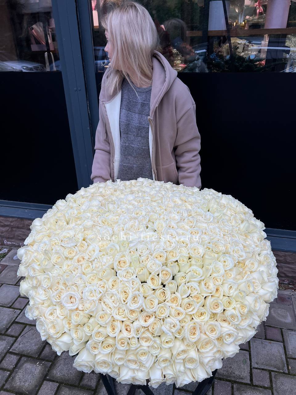 Пятьсот один бутон выстроены плотными рядами в глубокой корзине. Белоснежная композиция создаёт эффект цветочного облака, способного заполнить собой всё пространство вокруг.