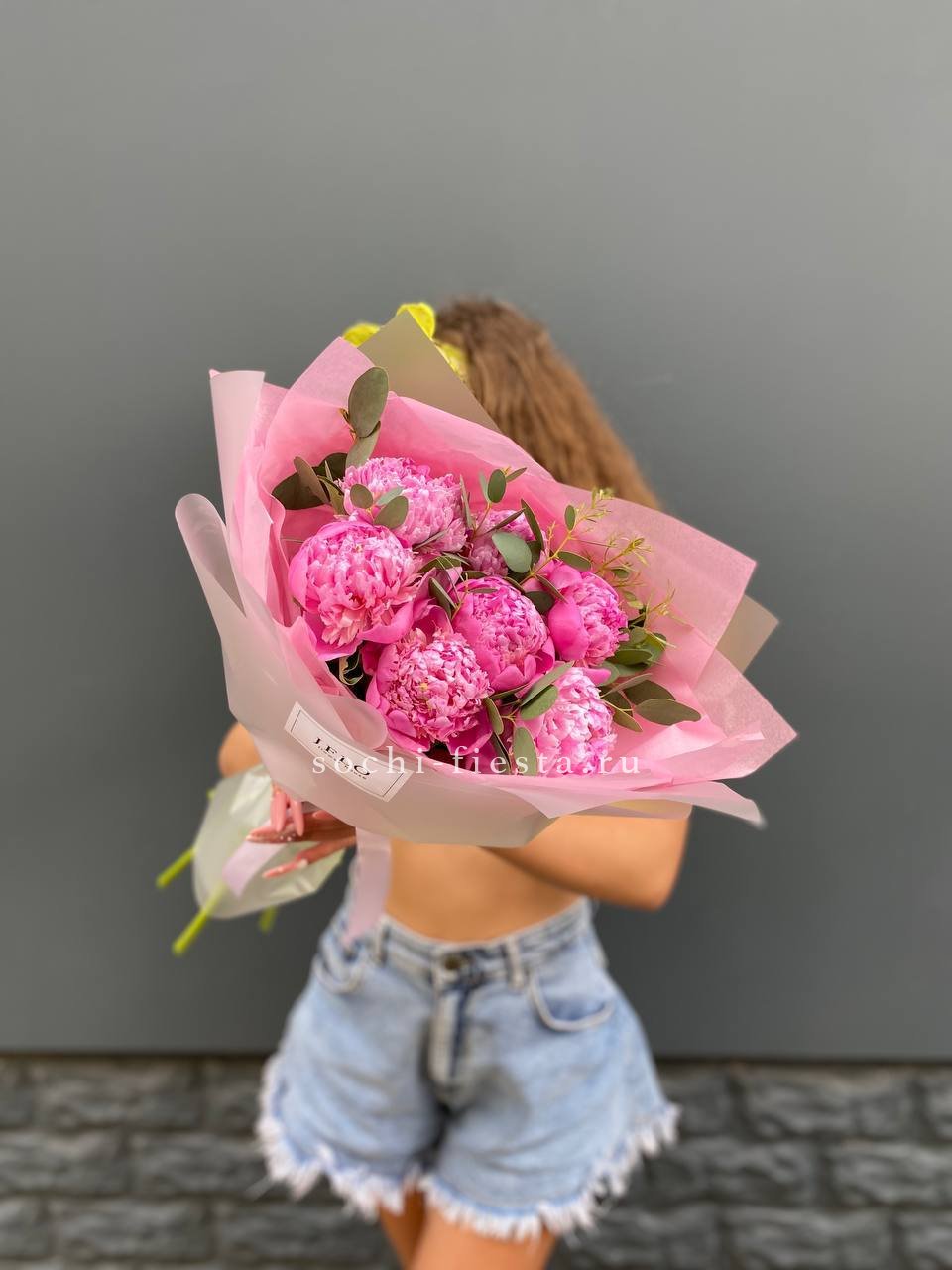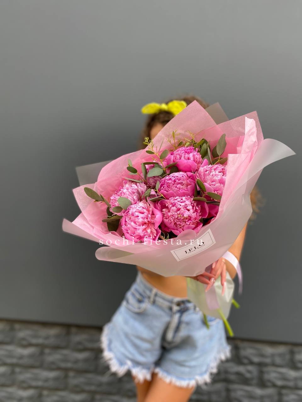Семь ярких пионов в окружении эвкалипта образуют компактную композицию с выразительным силуэтом. Зелень добавляет графичности, а воздушное тишью создаёт лёгкую дымку вокруг соцветий.