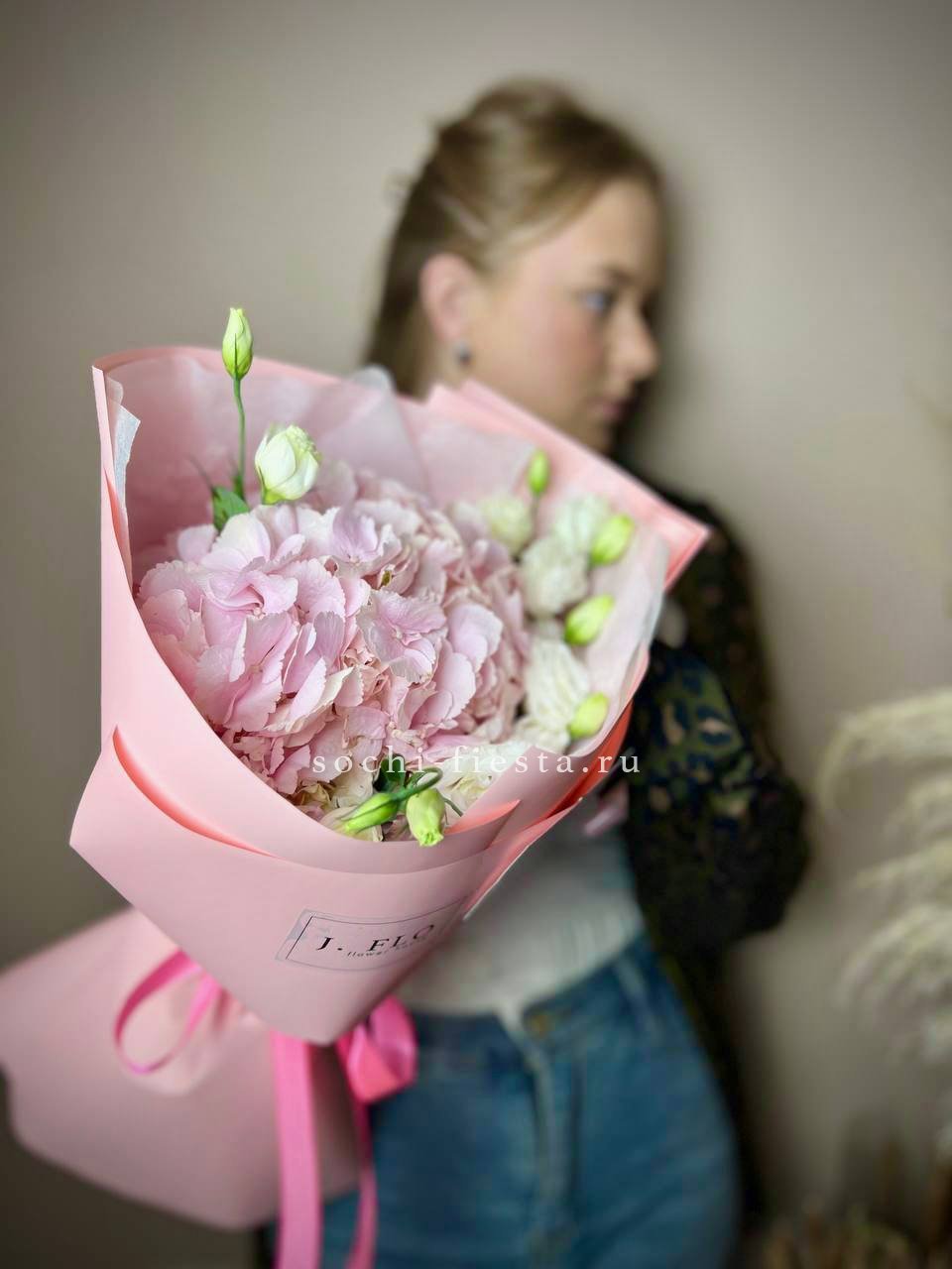 гортензия, вывернутые розы, лимониум(или аналог в несезон), лента, авторская упаковка.