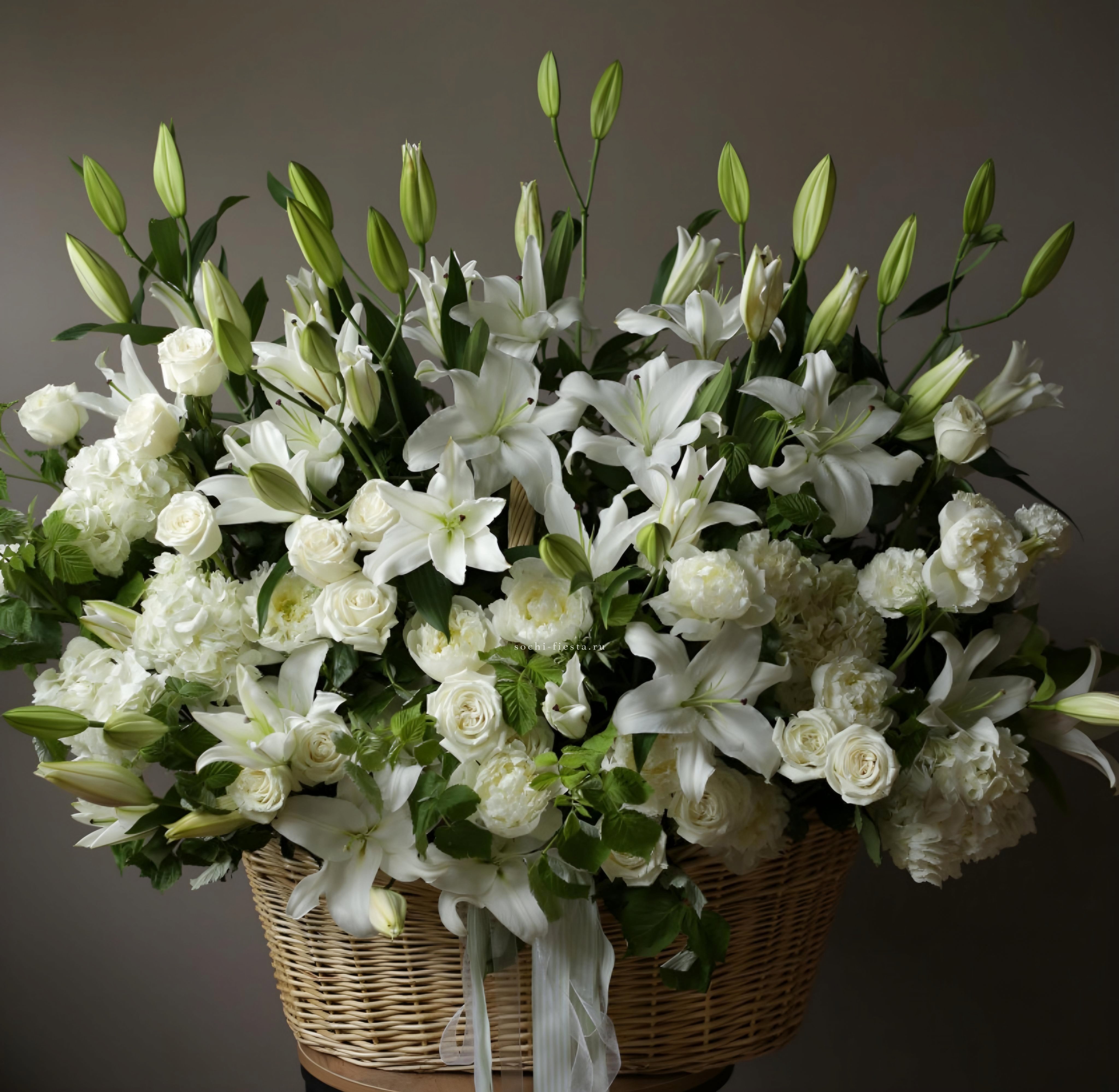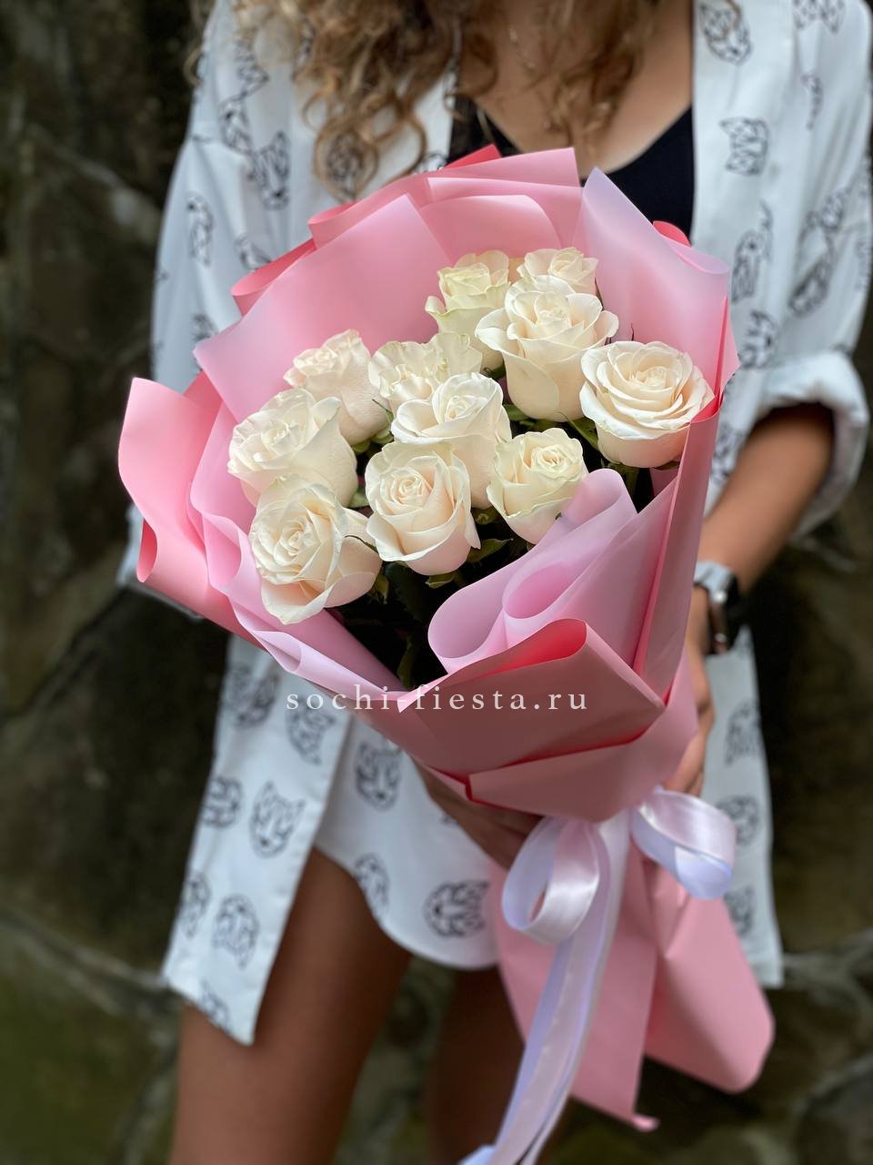 Белоснежные бутоны собраны в лаконичную форму с воздушной текстурой упаковки. Чистота линий и свежесть делают композицию универсальной для любого момента.