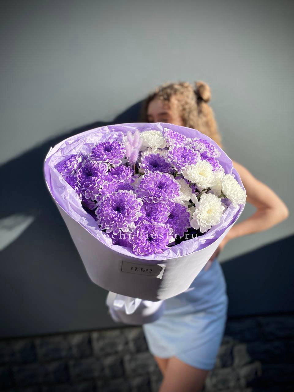 Пять веток кустовой хризантемы собраны в компактную форму с чёткими линиями. Лаконичная упаковка и лента сохраняют естественный объём соцветий. Букет выглядит собранно и свежо.