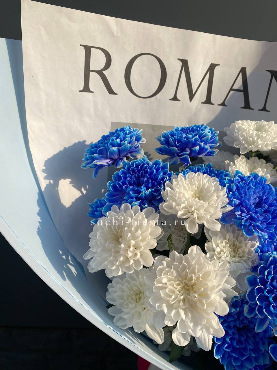 Девять веток кустовой хризантемы в синих оттенках собраны в плотный букет с лаконичной упаковкой. Насыщенный цвет и компактная форма создают яркое визуальное пятно в любом интерьере.