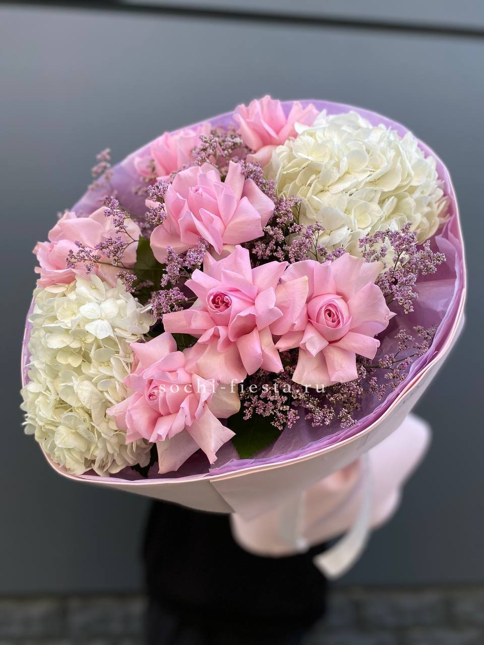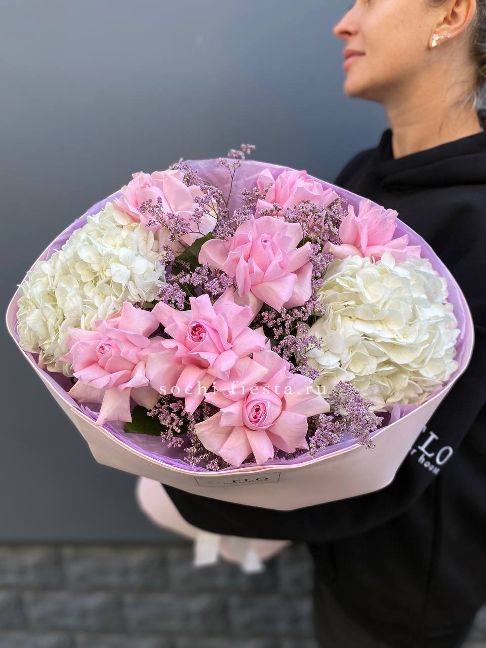 гортензия, хризантема, белая роза, гербера, статица, хлопок, упаковка.
