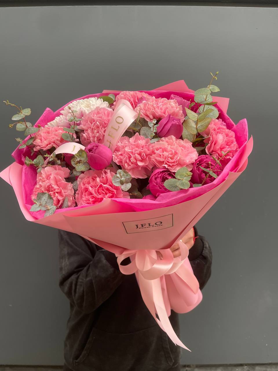 Этот букет — настоящий манифест женственности и ярких эмоций! Он выглядит очень эффектно за счет сочетания разных оттенков розового и игры фактур.