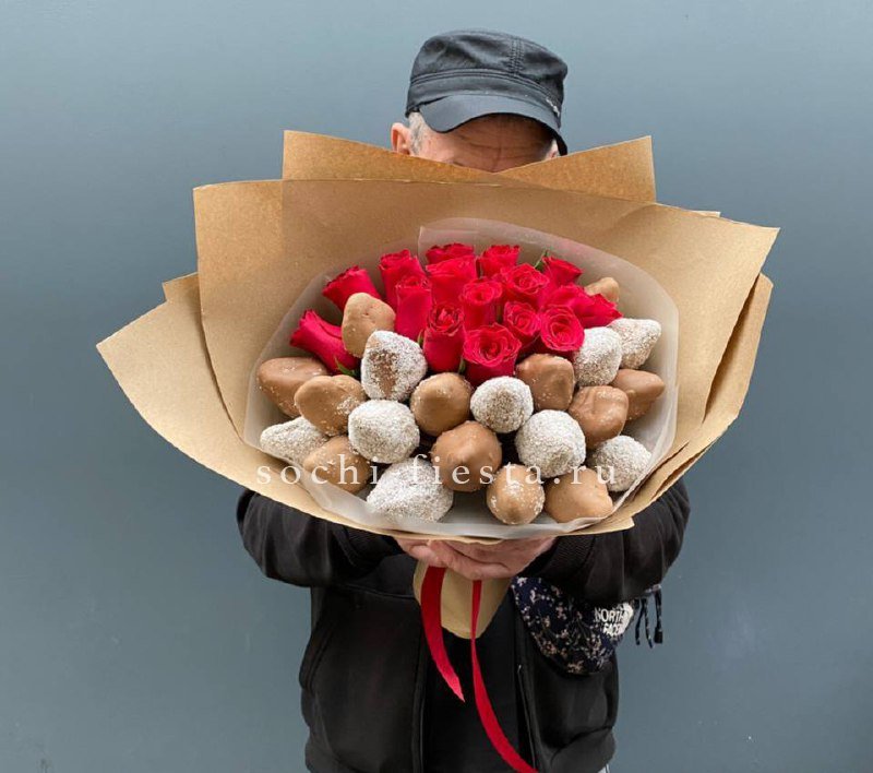 21 клубника в шоколаде, розы- 15шт., лента, оформление.