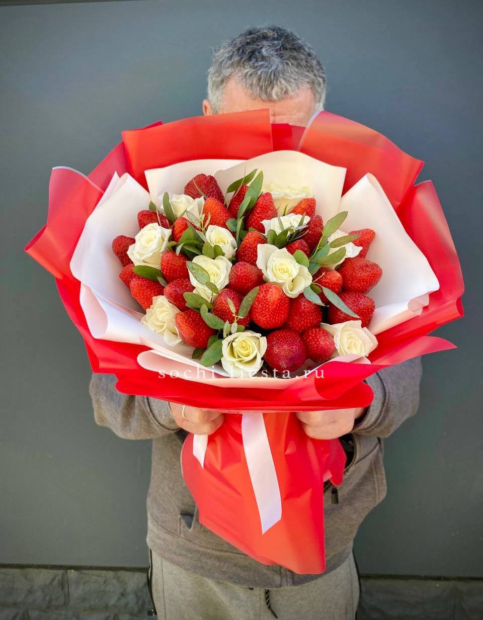 300-400г. ароматной клубники, кустовая роза, эвкалипт, лента, дизайнерская бумага.