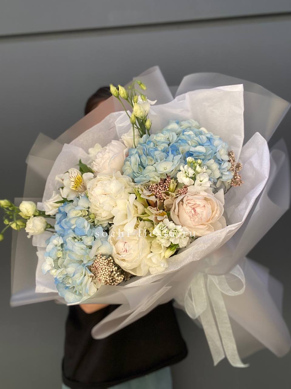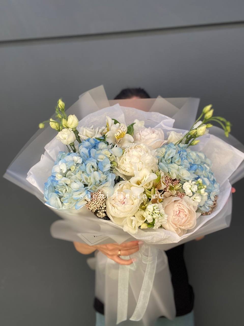 пионы, гортензии, эустома, альстромерии, маттиола, озатамус, лента и дизайнерская пленка.