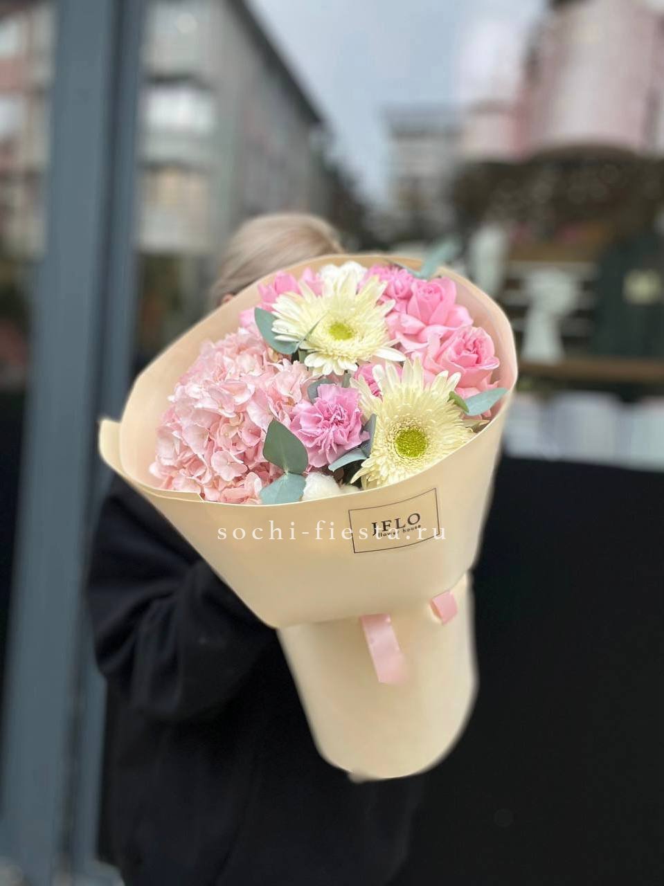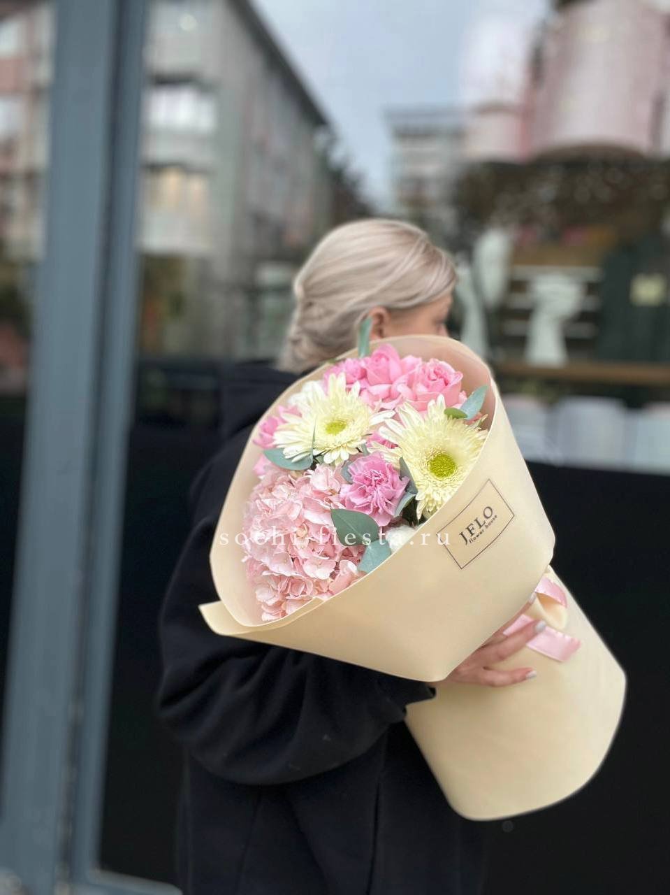 гортензия, роза, эустома, бомбастик,  эвкалипт, лента, дизайнерская пленка.