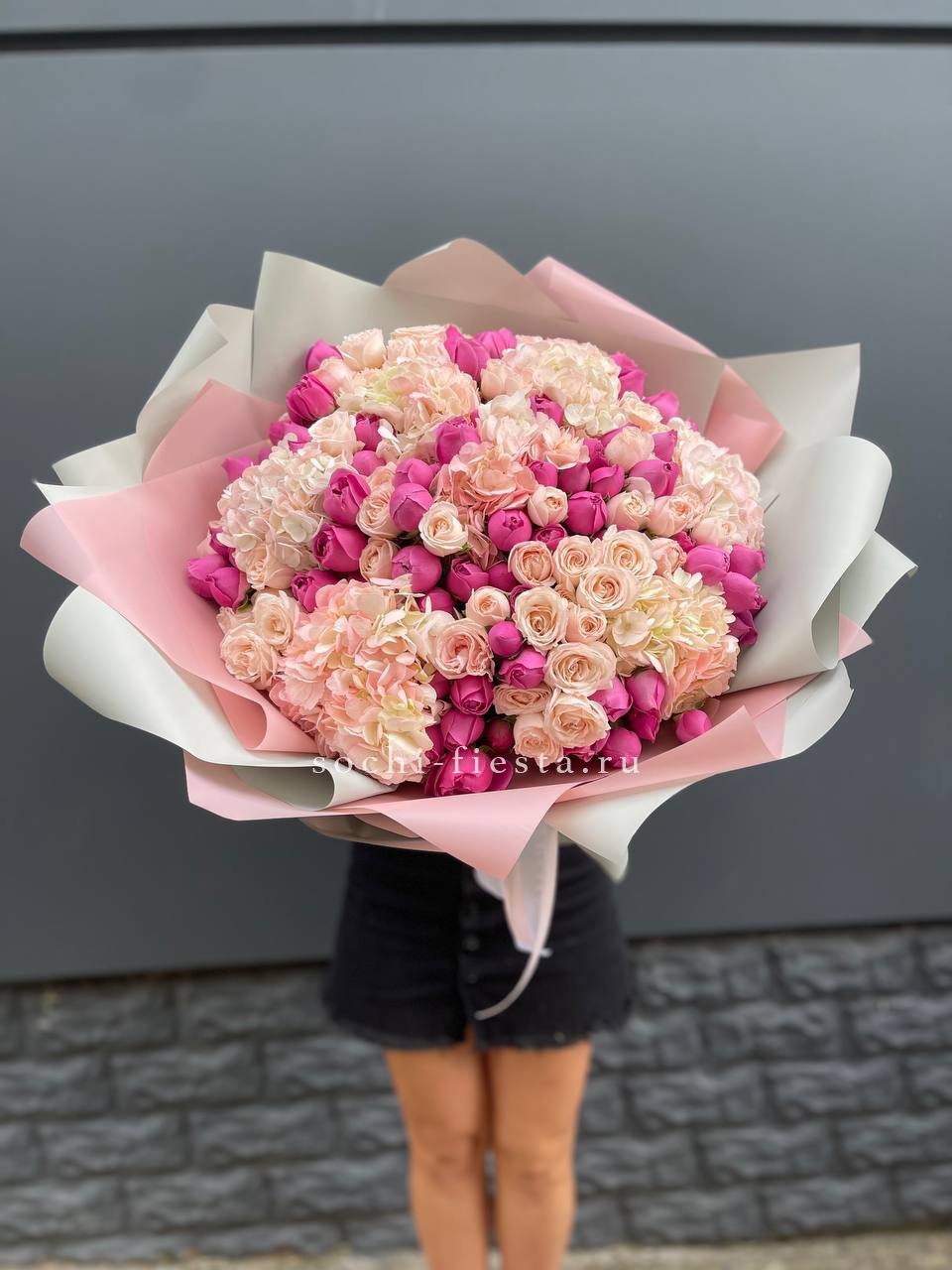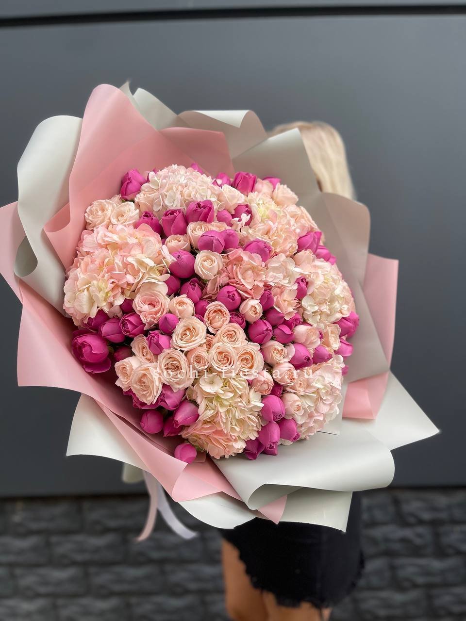 Пионы и пионовидные розы с их многослойными лепестками создают визуальную глубину, а маттиола добавляет вертикальные линии. Букет впечатляет плотностью и объемом раскрывшихся бутонов.