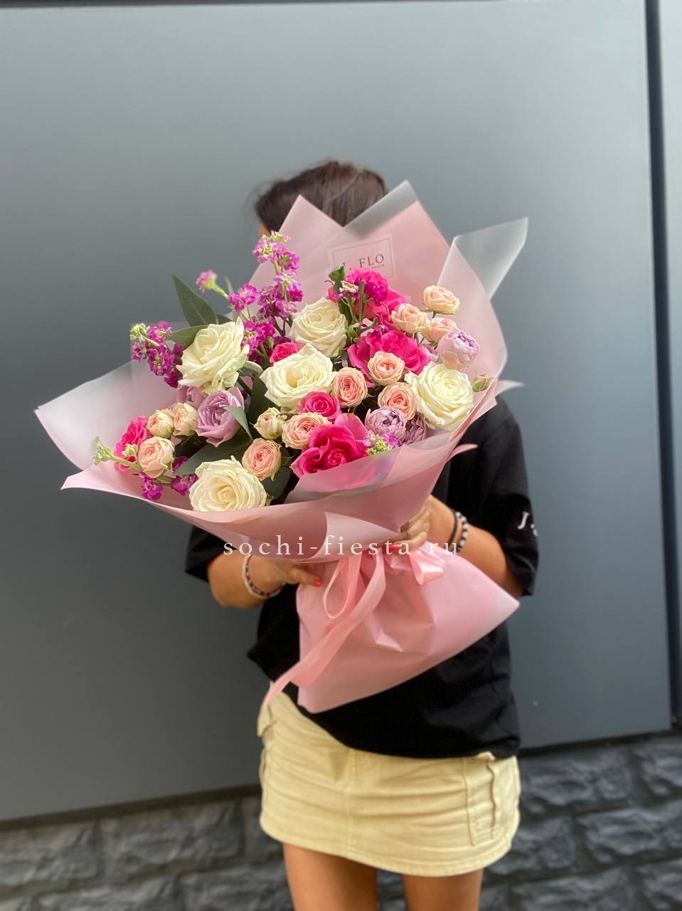 розы, кустовые розы Мисти Баблс, бомбастик, маттиола (или аналог вне сезона),  лента, дизайнерская пленка.