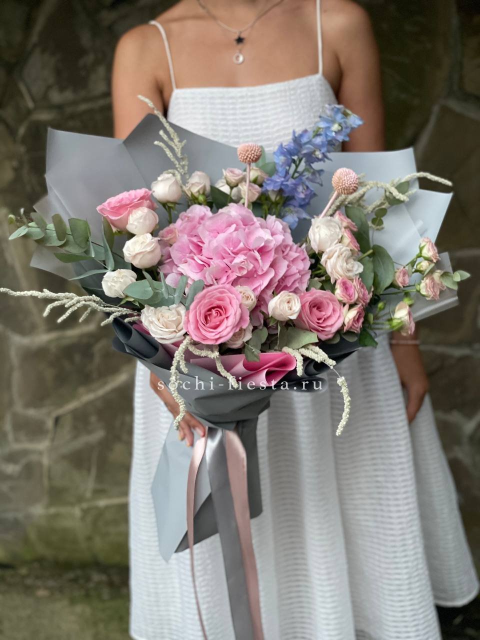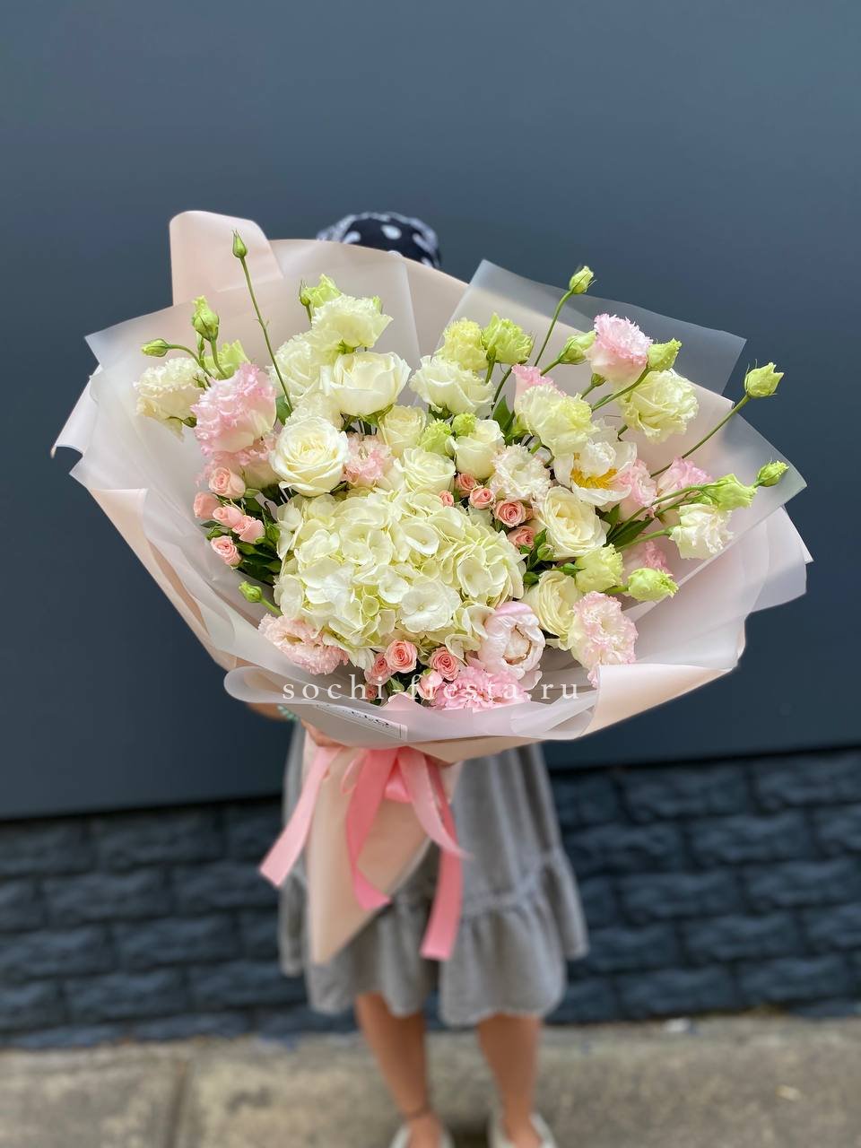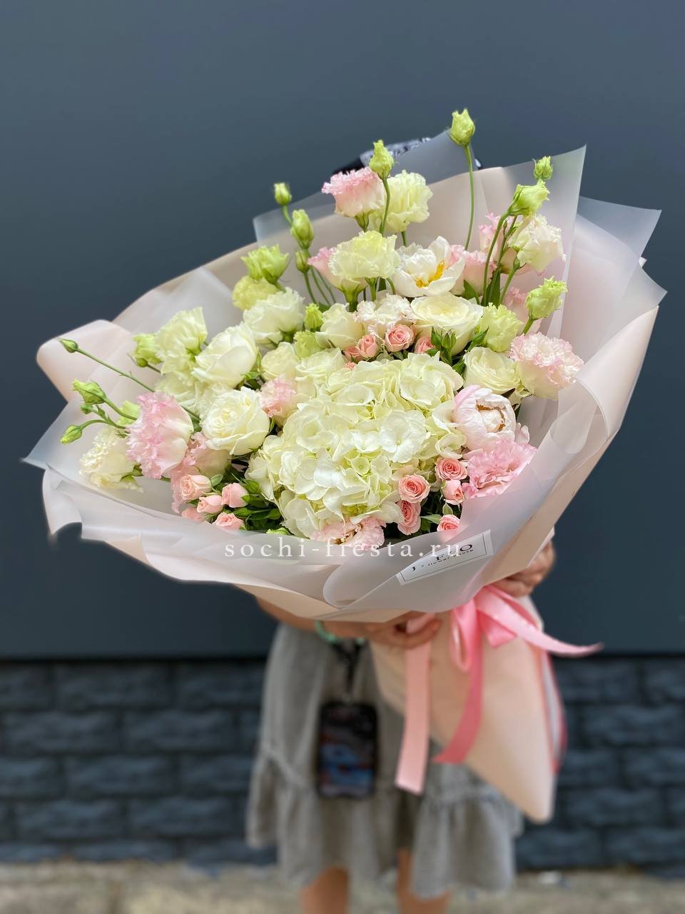 Белые розы и эустома образуют светлую основу, которую дополняют пионы и гортензия. Крафтовая упаковка удерживает форму, позволяя цветам раскрыться естественно и свободно.