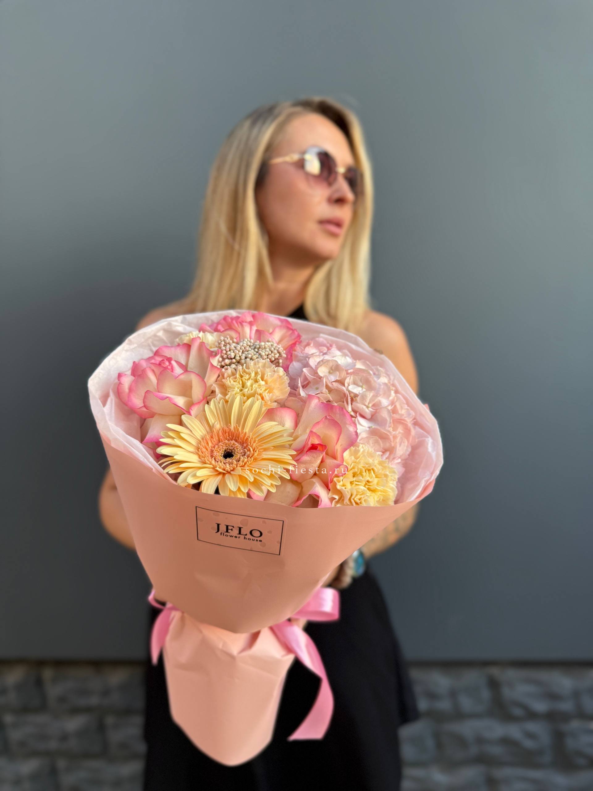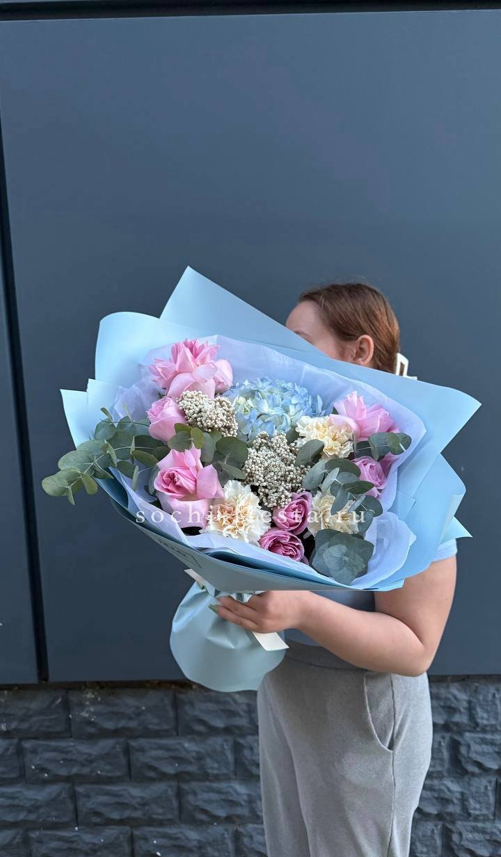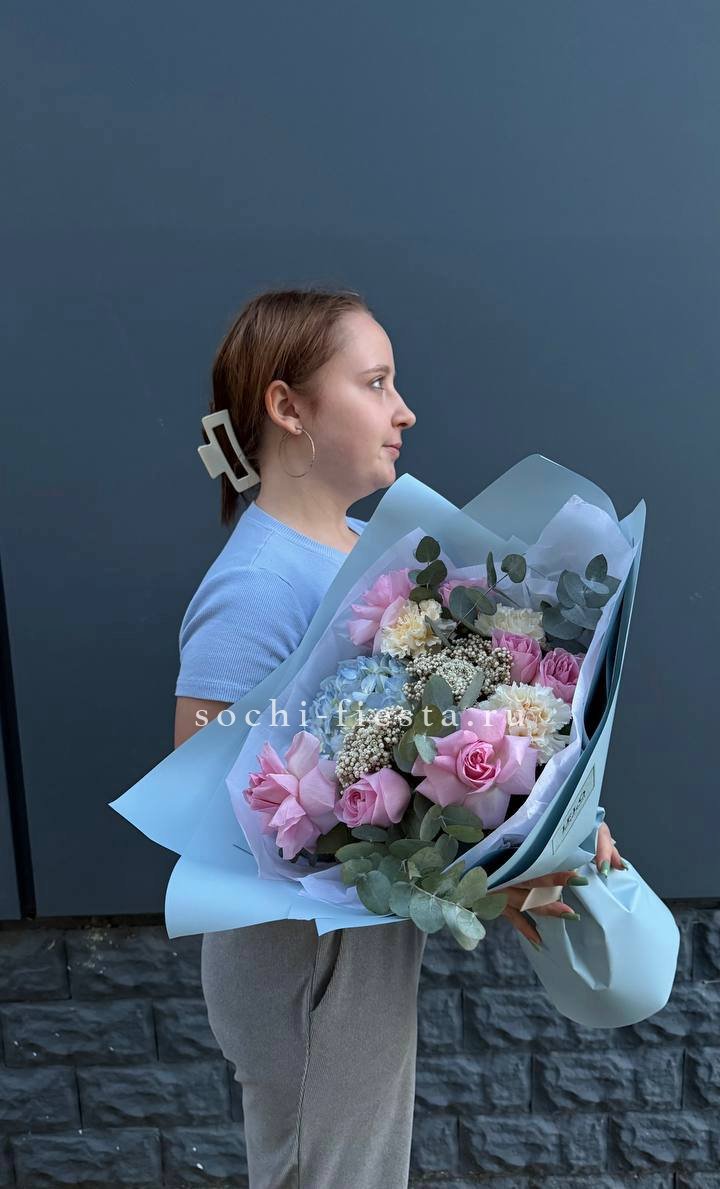Мягкие пионовидные формы переплетаются с классическими розовыми бутонами в плотной округлой композиции. Эвкалипт освежает палитру и придаёт букету завершённость.