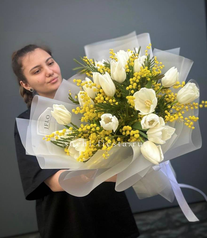 Двадцать пять тюльпанов встречаются с солнечной мимозой в весеннем дуэте. Букет держит форму и радует глаз сочной зеленью стеблей. Это композиция для тех, кто ждал тепла и света.