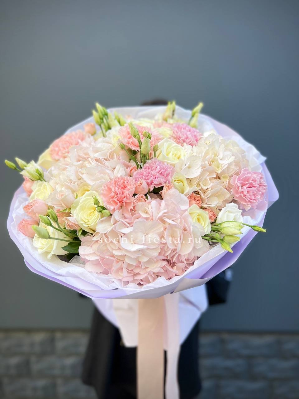 Весенняя встреча сирени и пионовидных кустовых роз в лёгкой упаковке. Ароматный дуэт для тех, кто ценит естественность и простоту.