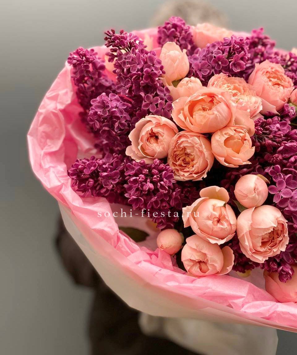 сирень, кустовые пионовидные розы, тишью, пленка, лента.