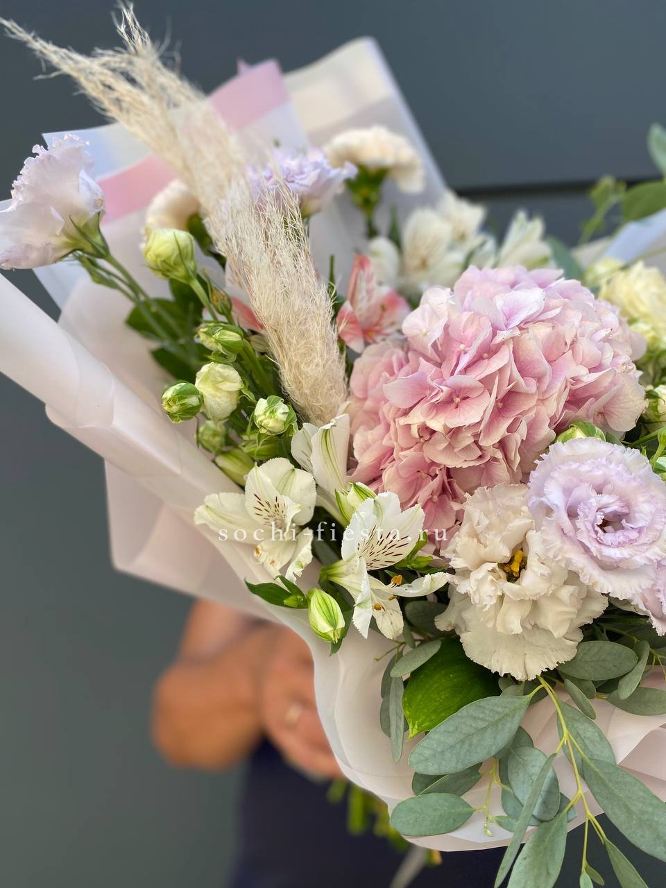 гортензия, эустома, кустовая пионовидная роза, альстромерия, диантус, лента, дизайнерская упаковка.