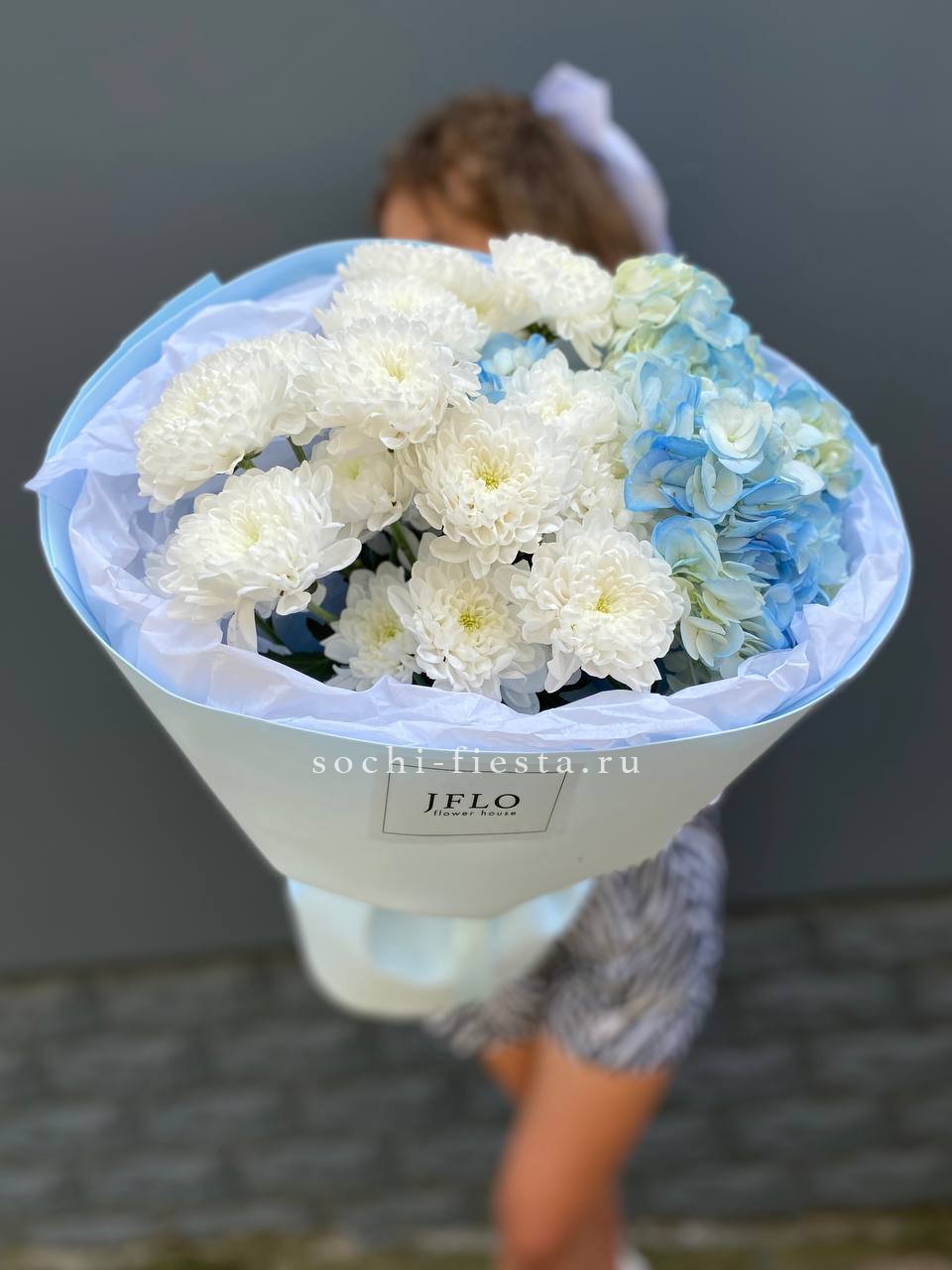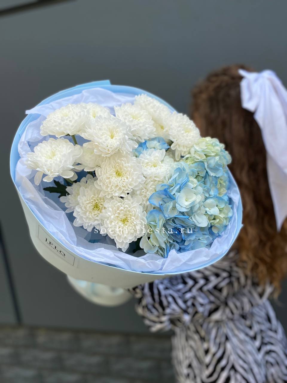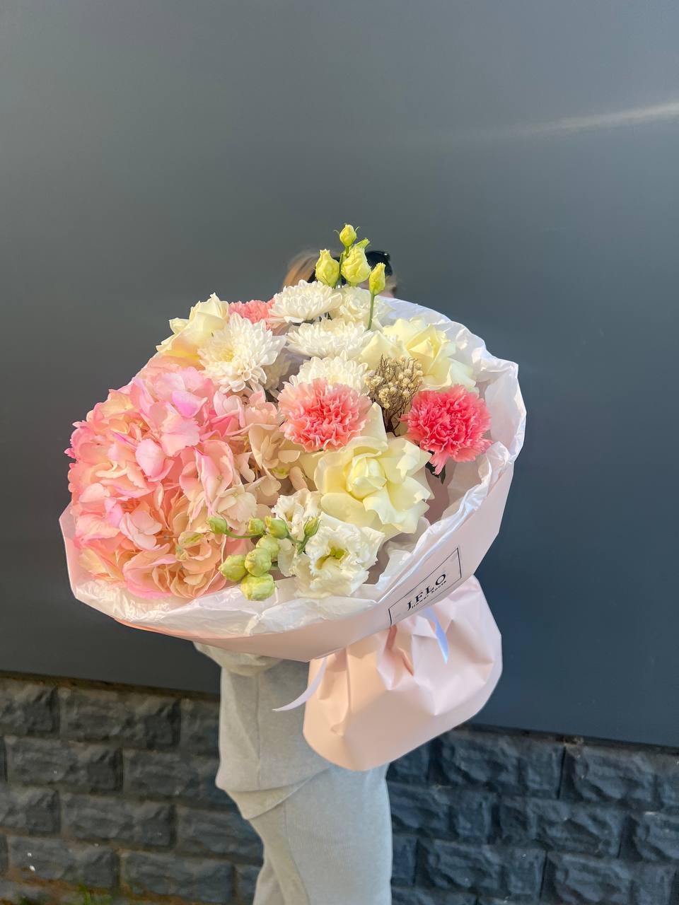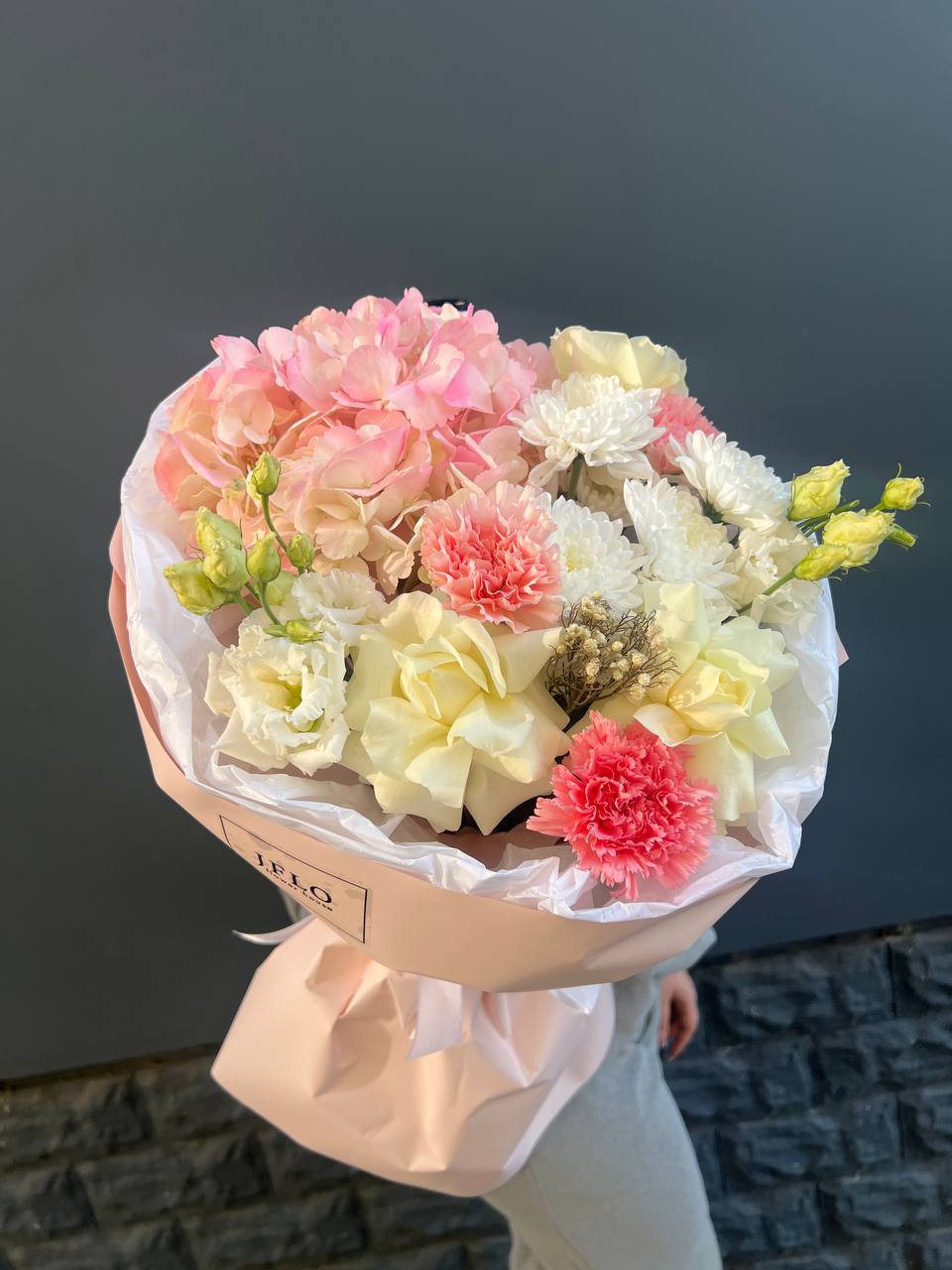гортензия, розы, диантусы, хризантема, пионы (или пионовидные розы), эустома, корзина. Состав может меняться, в зависимости от сезона.