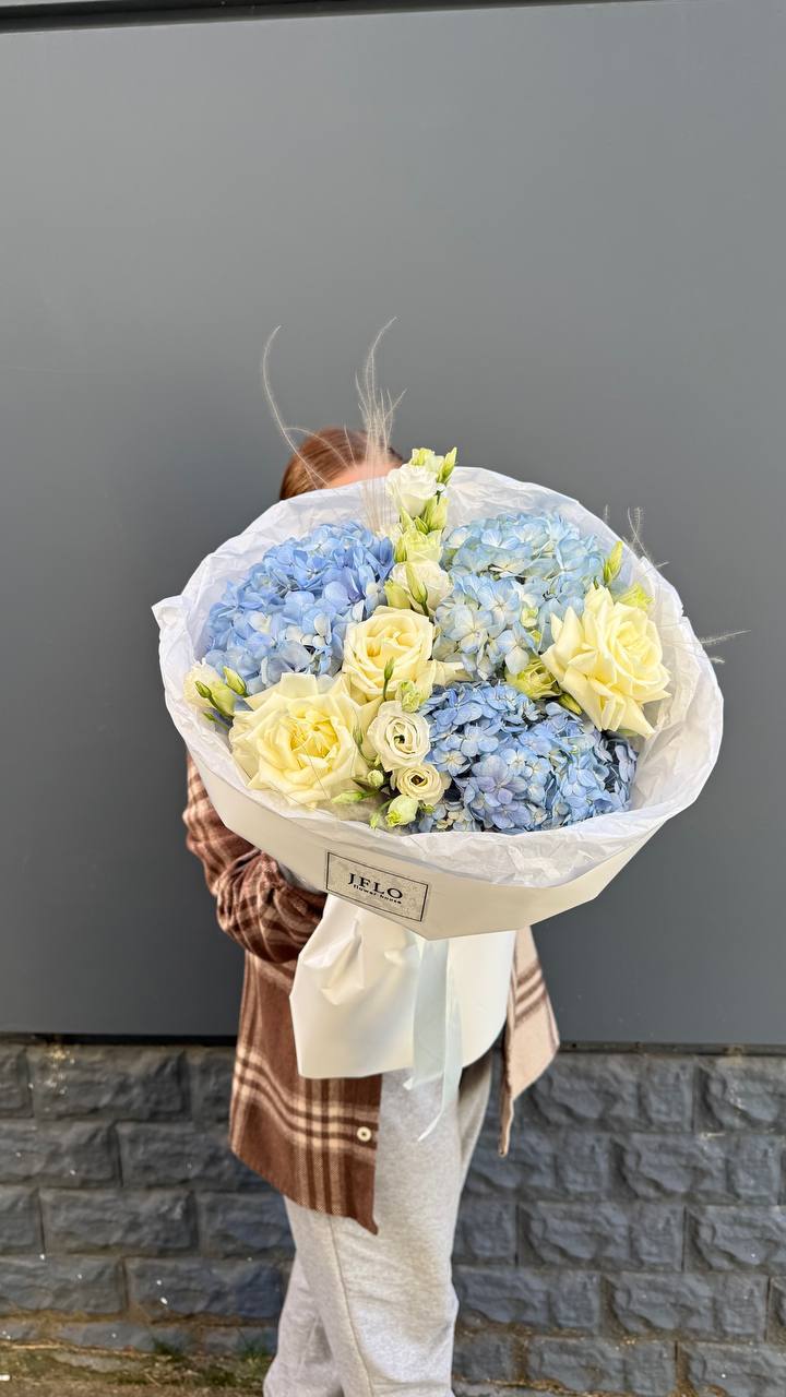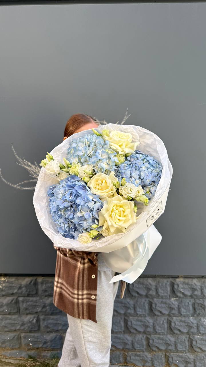 гортензия, пионовидная кустовая роза Мисти Баблс, лента, дизайнерская упаковка.