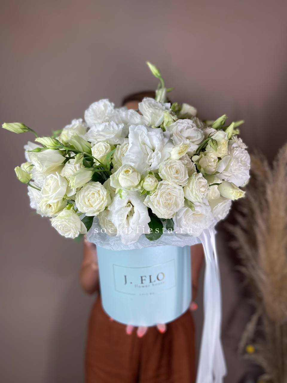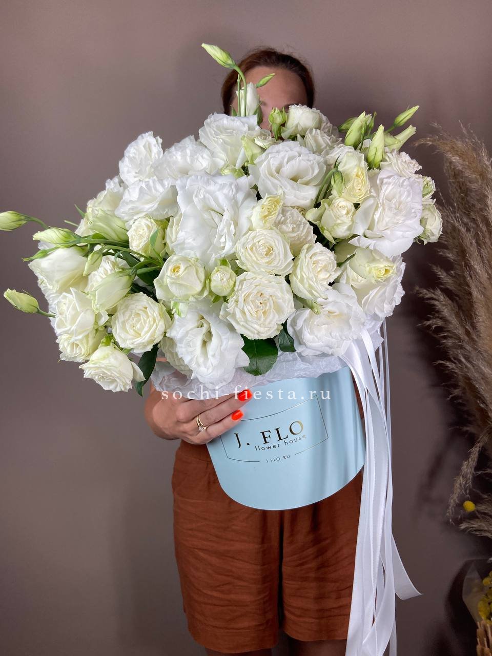 пионы, лилии, белые розы, эустомы, диантусы, маттиолы, статица, альстромерия, эвкалипт, цилиндр - D25, лента, упаковка. Состав может меняться в зависимости от сезона.