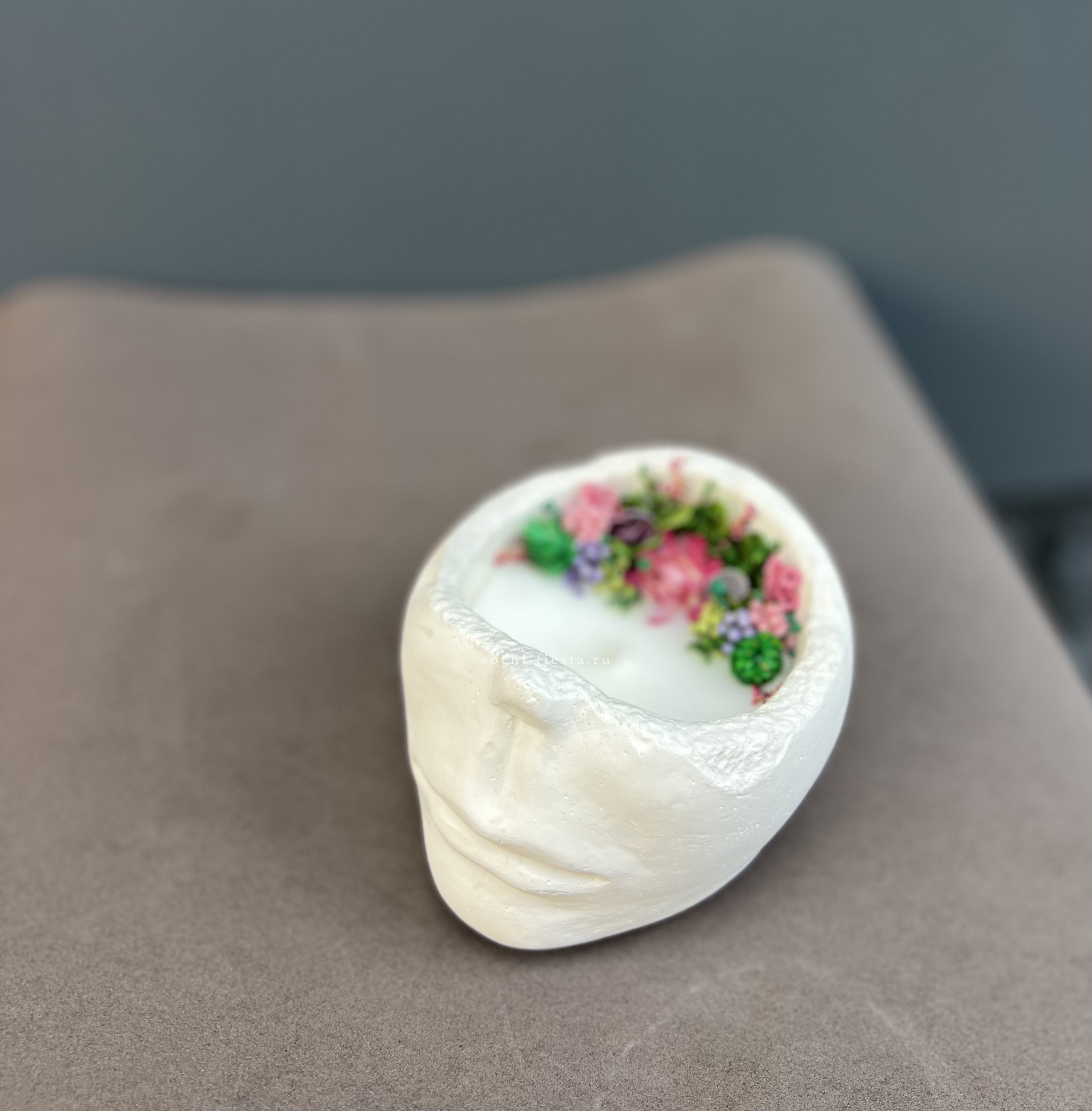 Ручная работа из кокосового воска с ароматом бузины в матовом гипсовом корпусе. Скульптурная форма лица добавляет интерьеру графичности и современного звучания.