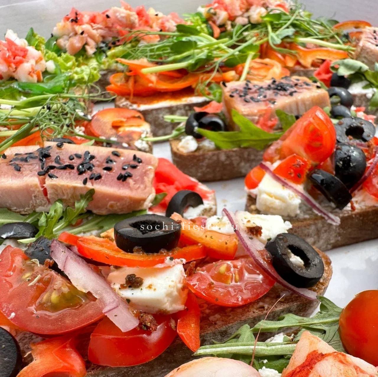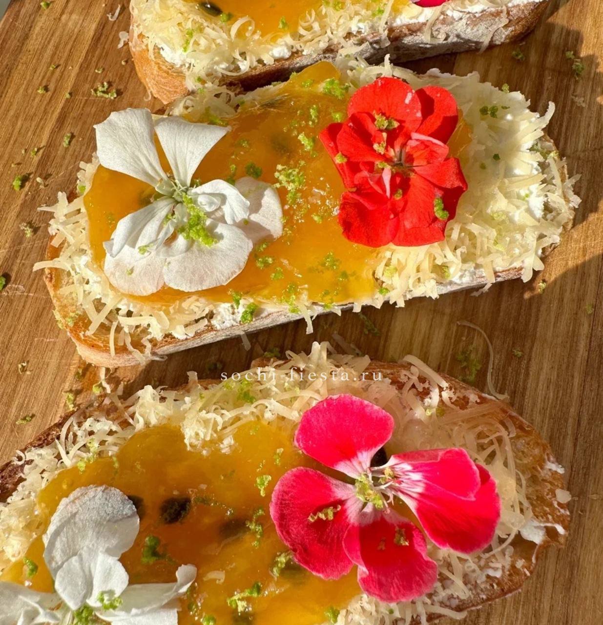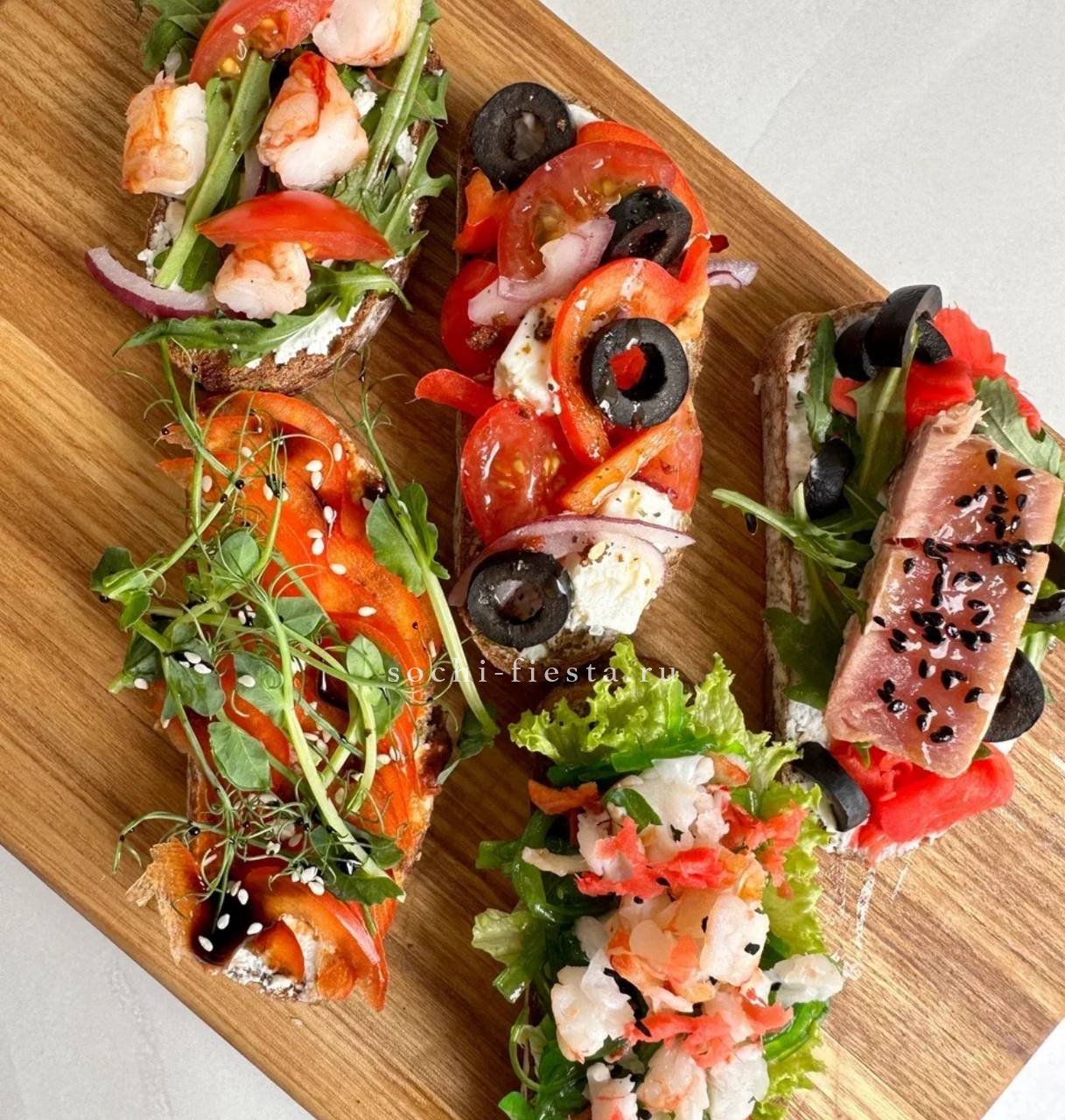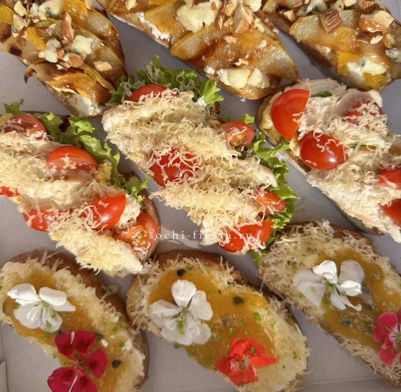 брускетта с голубым сыром и карамелизированной грушей- 3 шт.,  брускетта Цезарь- 3 шт., брускетта сырная с манго-маракуйя- 3 шт.