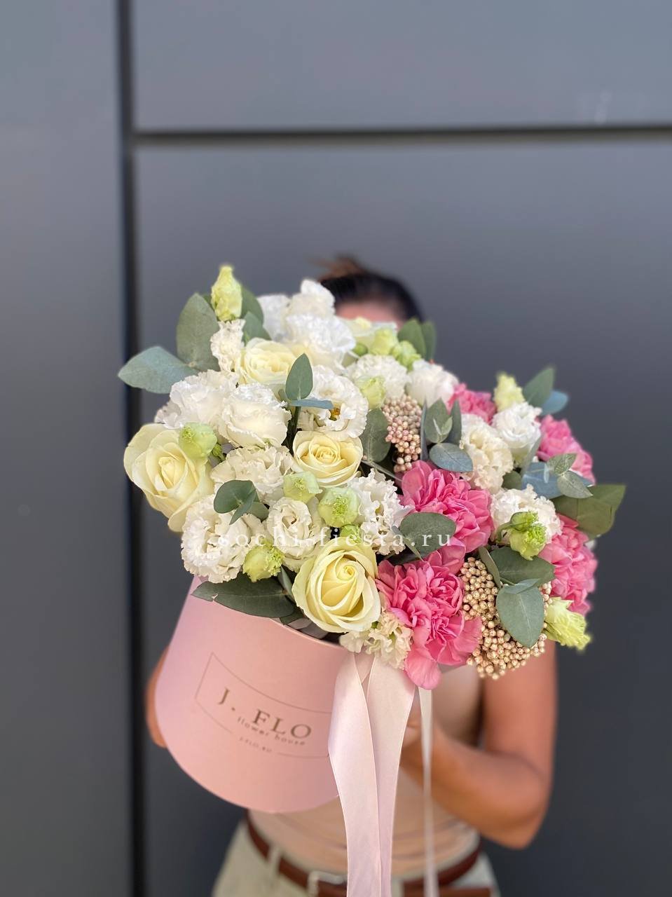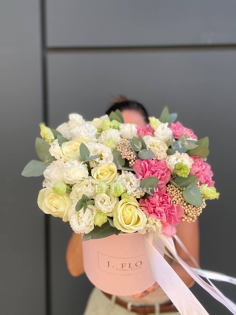 Белые розы и эустомы перекликаются с пастельными соцветиями гортензии, а озотамнус добавляет фактурные акценты. Эвкалипт обрамляет композицию серебристыми нотами.