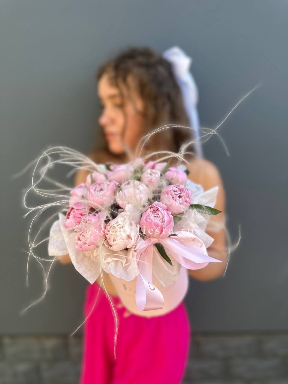 Пятнадцать пионов образуют пышную шапку над узким цилиндром. Стифа создает легкую дымку вокруг бутонов. Форма композиции позволяет разместить её даже на небольшой поверхности.