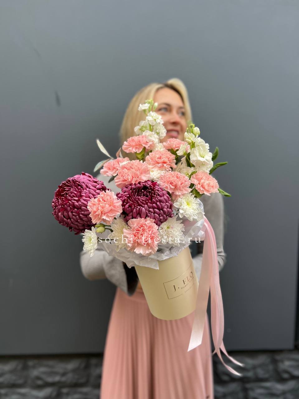 Компактная композиция с яркими одноголовыми хризантемами и душистой маттиолой в круглой коробке. Диантус добавляет графичности, а тишью смягчает линии. Цвет упаковки можно выбрать под настроение.