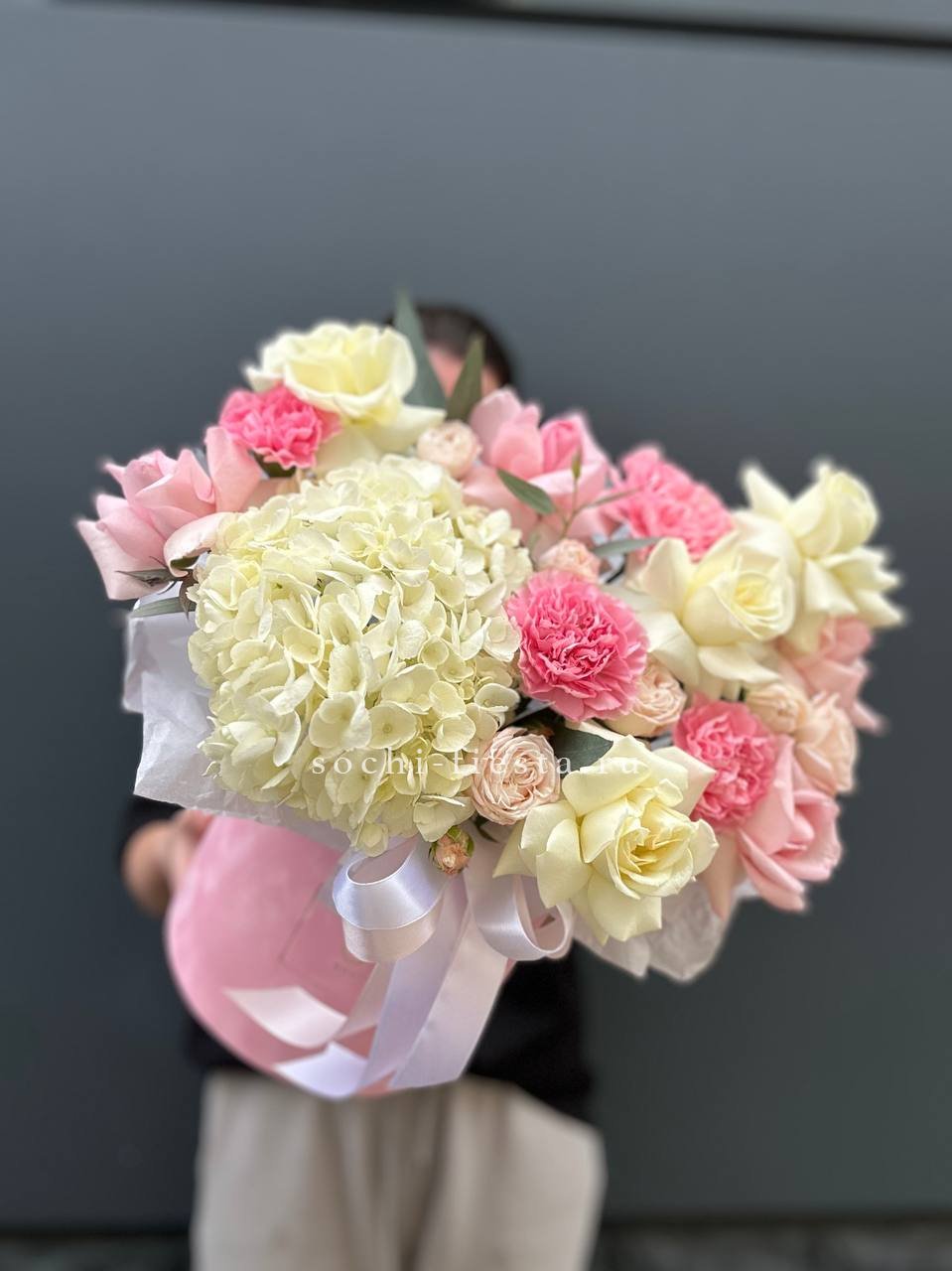 Пятьдесят один пион в одной композиции — это объём, который заполняет собой всё вокруг. Бутоны плотно уложены в цилиндр, создавая эффект цветочного облака. Такой масштаб запоминается с первого взгляда.