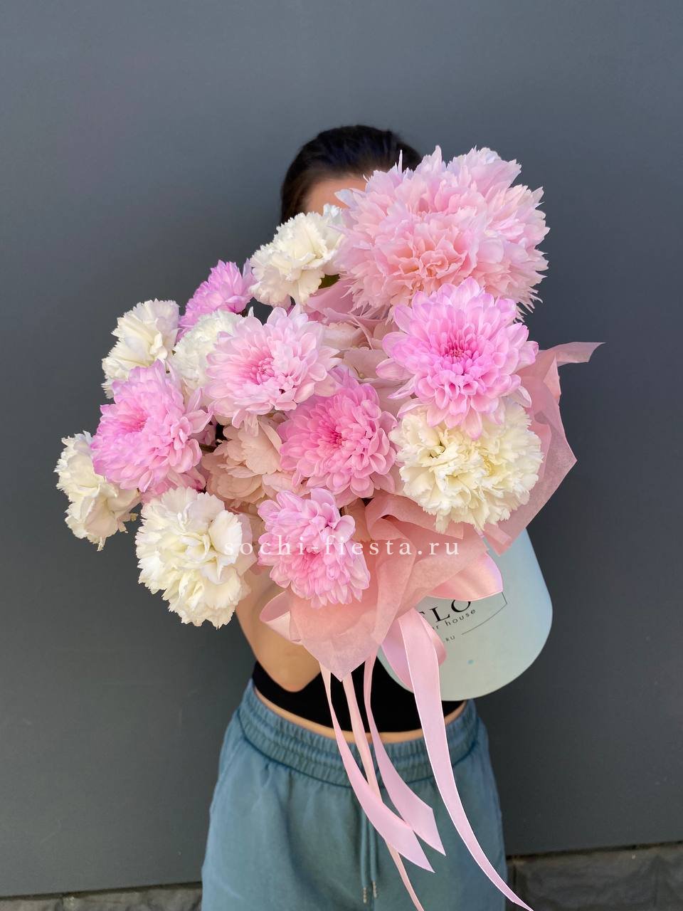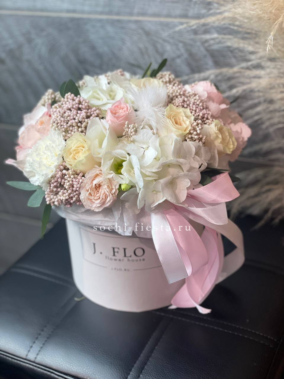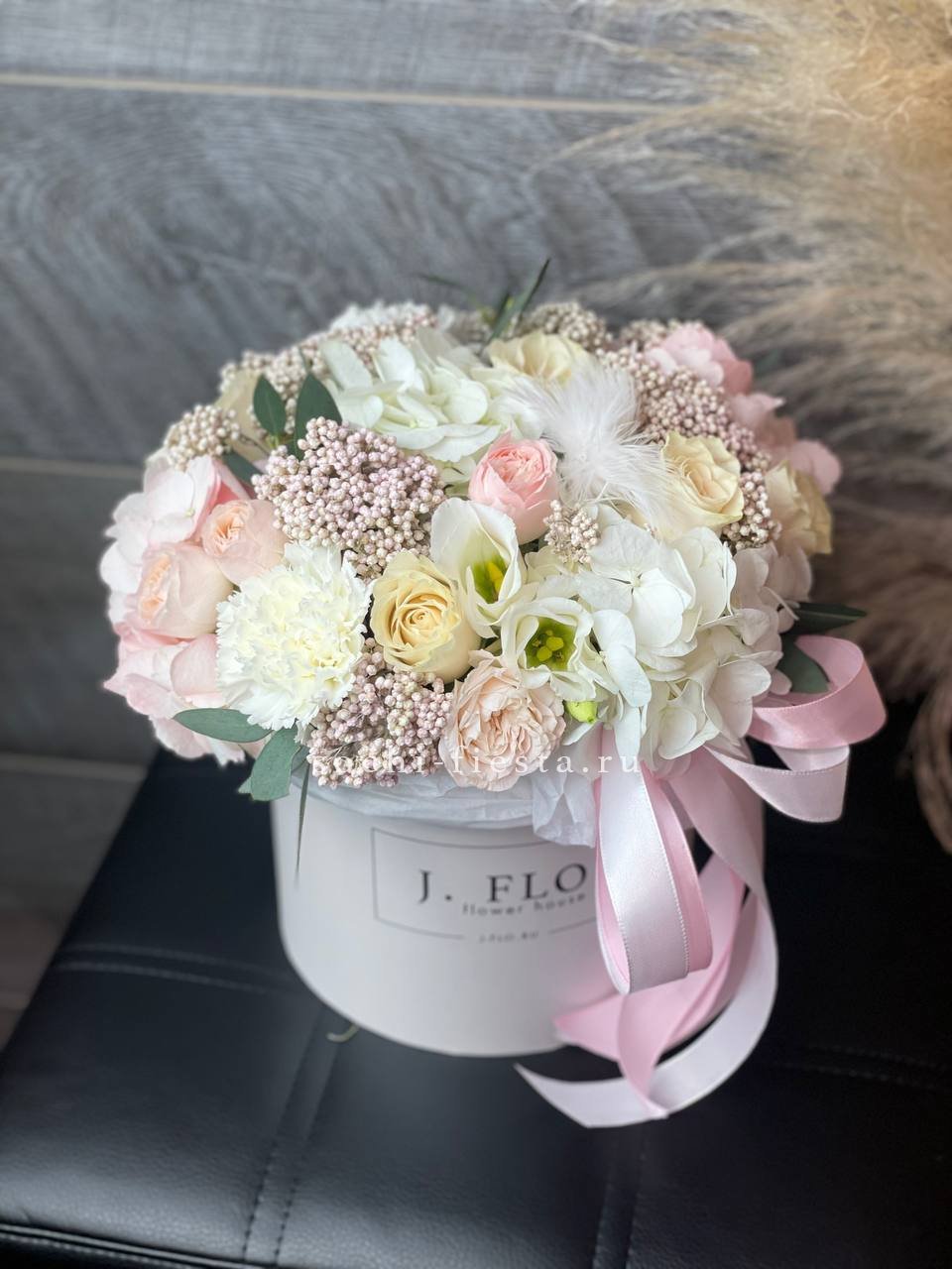 гортензия, вывернутые розы, диантус, кустовая роза, эустома, бокс D20, тишью.