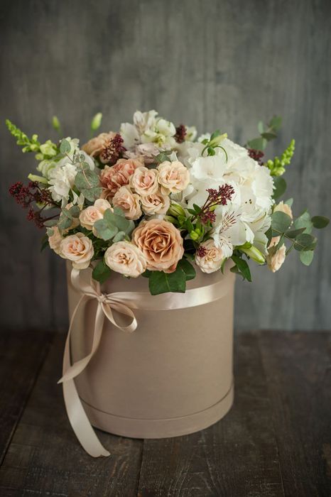 пионовидная роза сорта Мисти бабблс, эвкалипт в коробке или корзине.