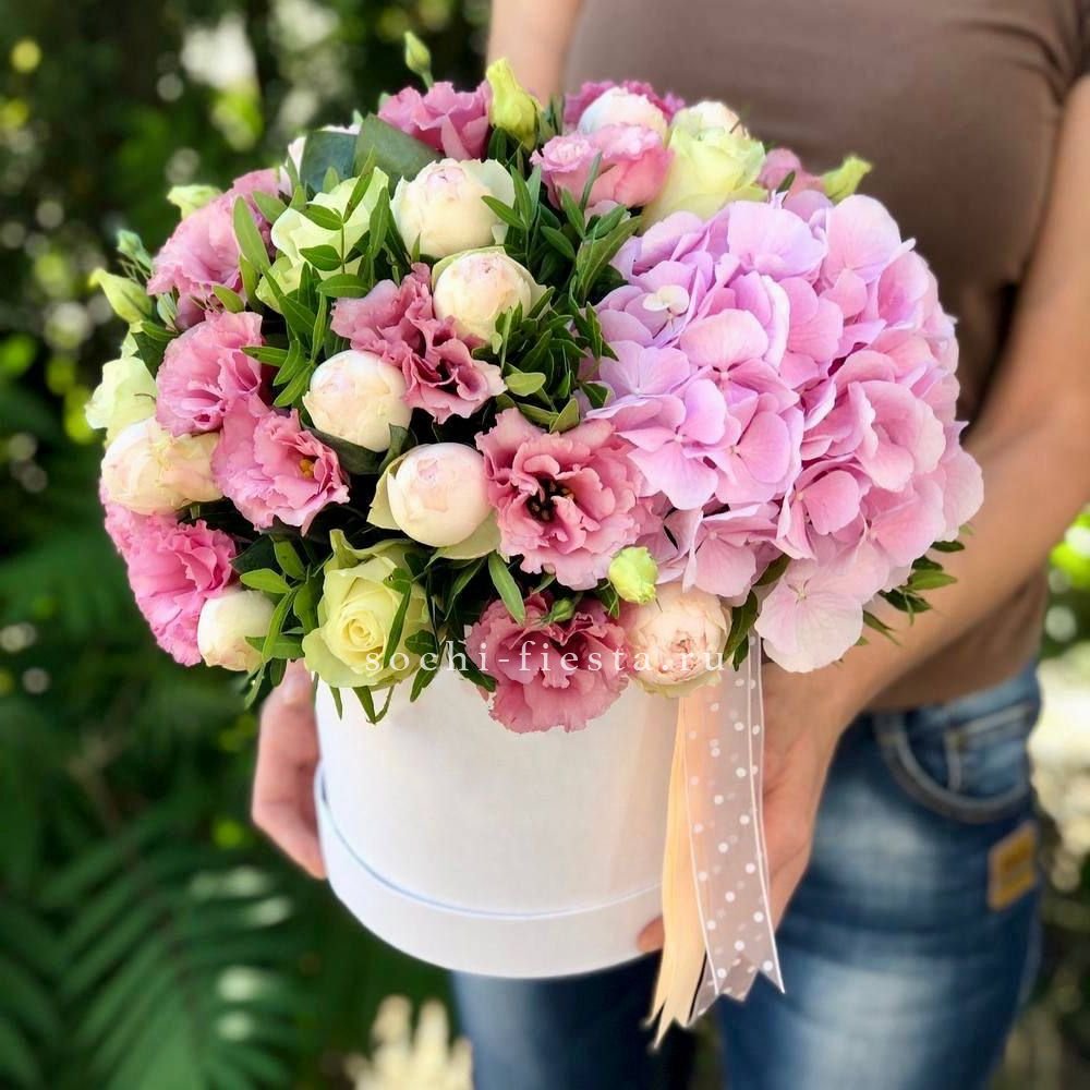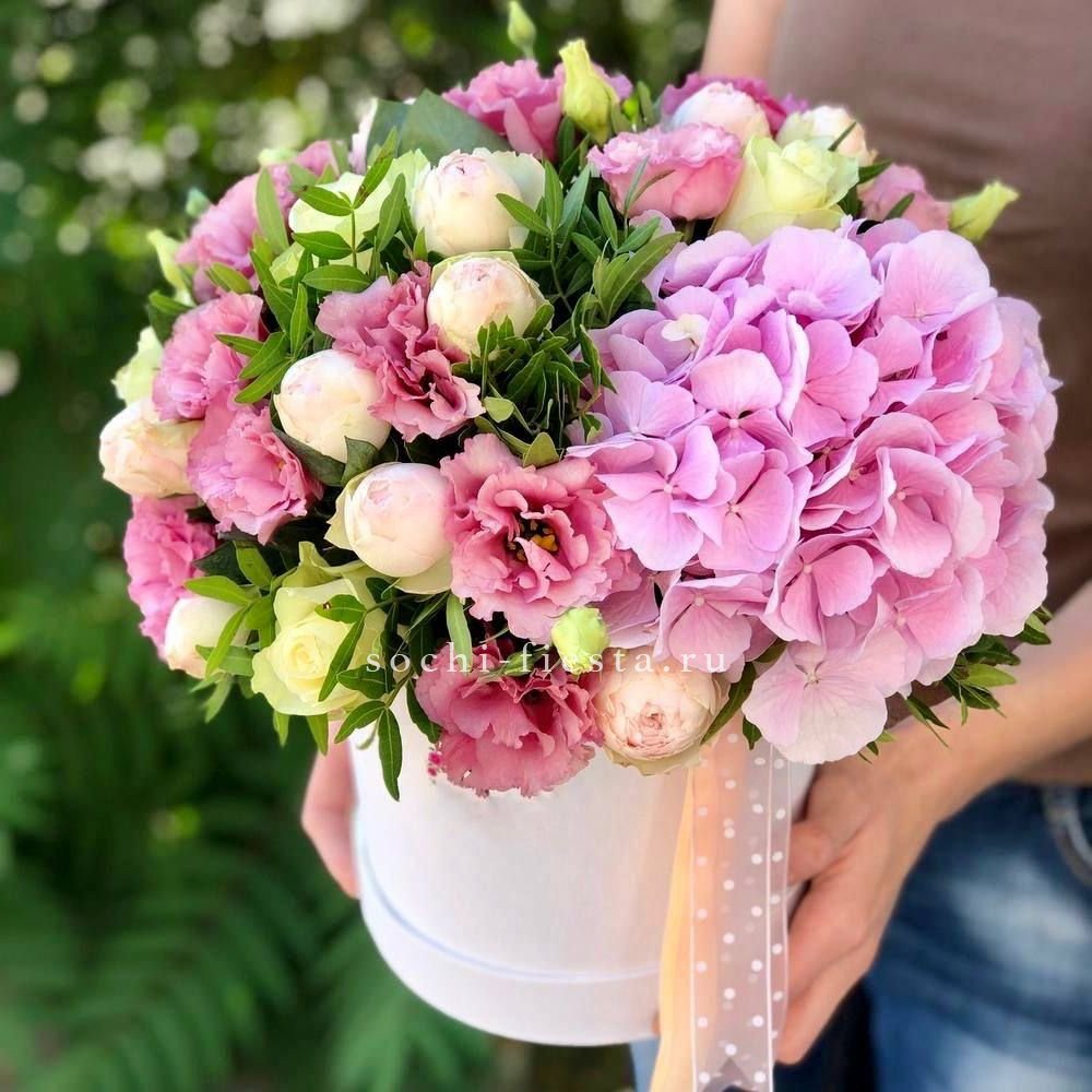 гортензия, кустовые розы, эустома, эвкалипт, лента, цилиндр D16.