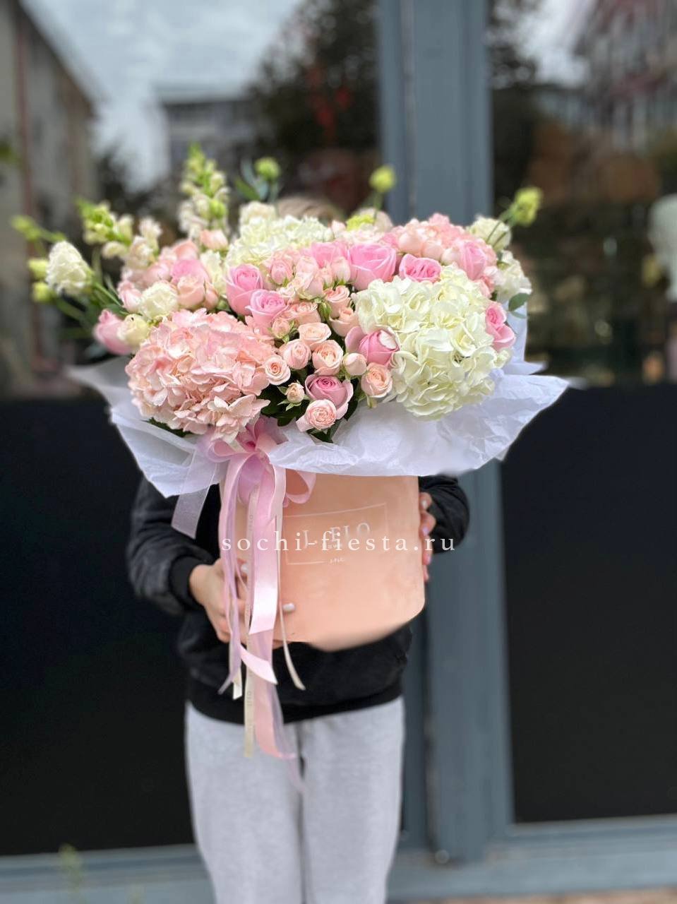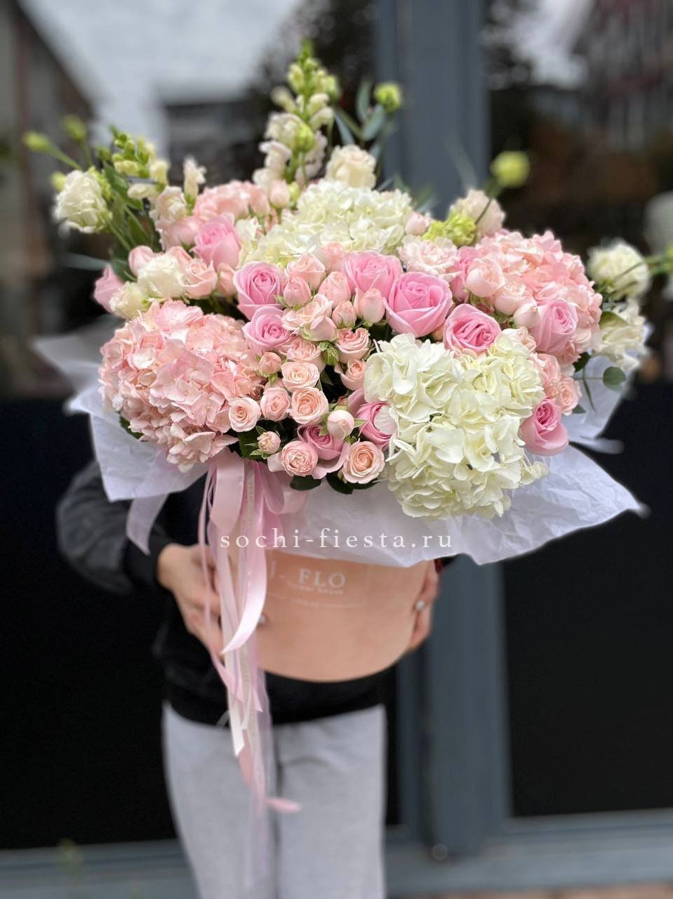 гортензия, кустовые розы, диантус, мисти баблс, эвкалипт, лента, цилиндр D16.