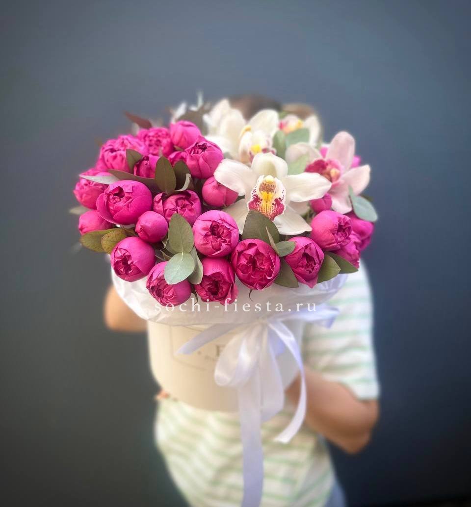 пионовидная кустовая роза Мисти Баблс, орхидея Цимбидиум, цилиндр D20, лента.