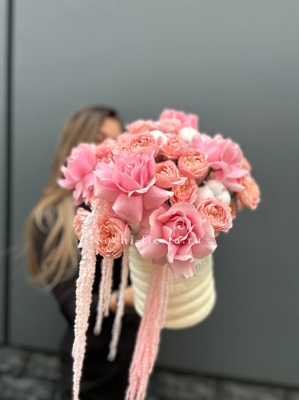 Розовая палитра переходит от французских роз к кустовым Джульетта с добавлением хлопка. Композиция в цилиндре сочетает воздушность и плотность фактур.