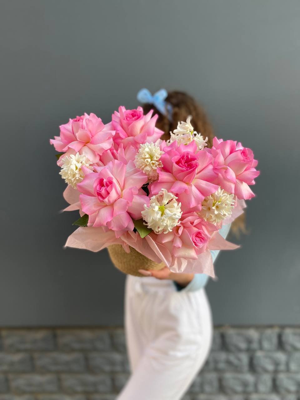 Живые гиацинты и свежие розы собраны в компактную композицию с природной текстурой джута. Корневая система сохранена, что позволяет цветам радовать дольше обычного букета. Готовое решение для дома или рабочего пространства.