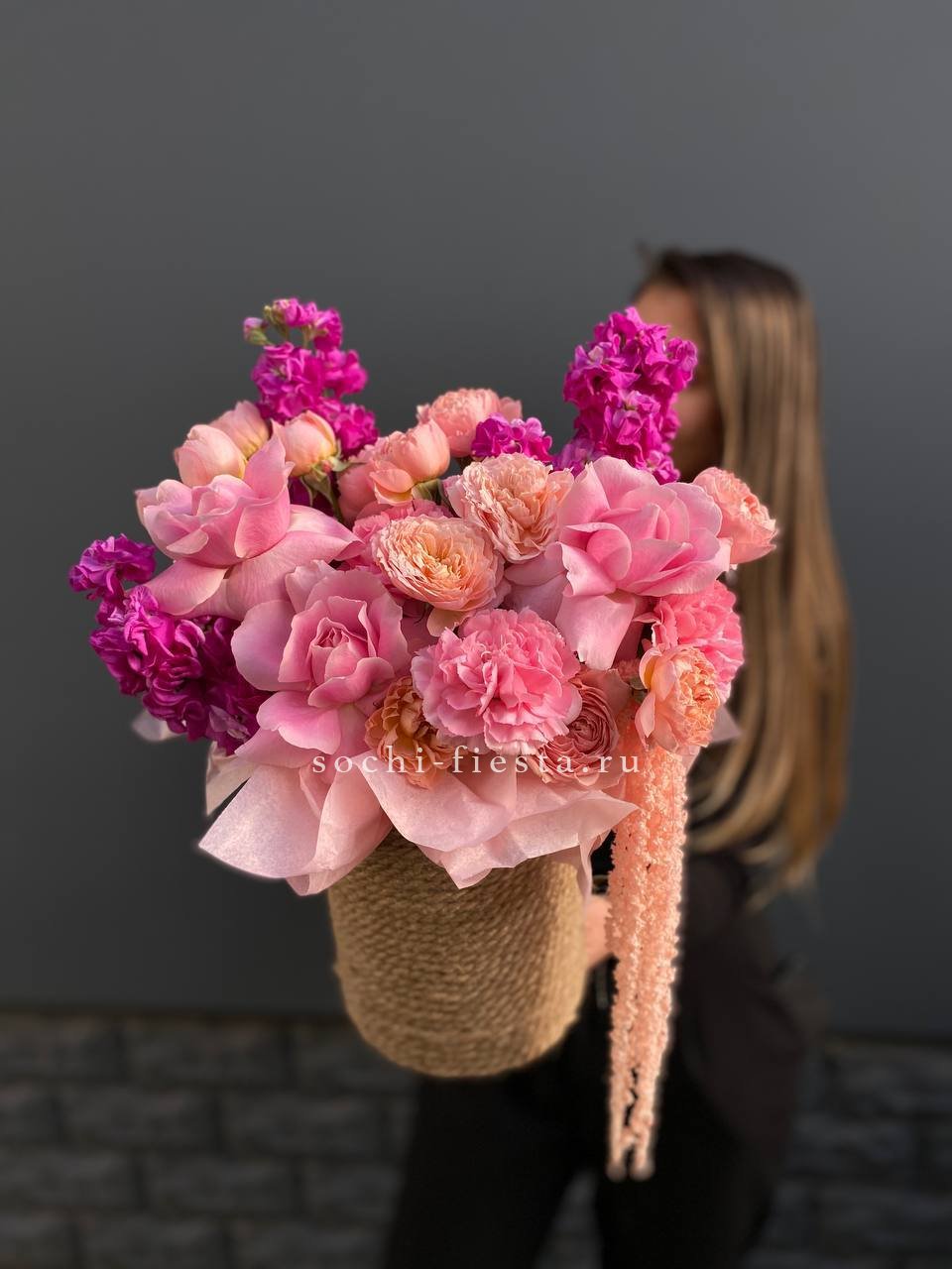 маттиола, французские розы, кустовые пионовидные розы, дианутсы, амарантус.