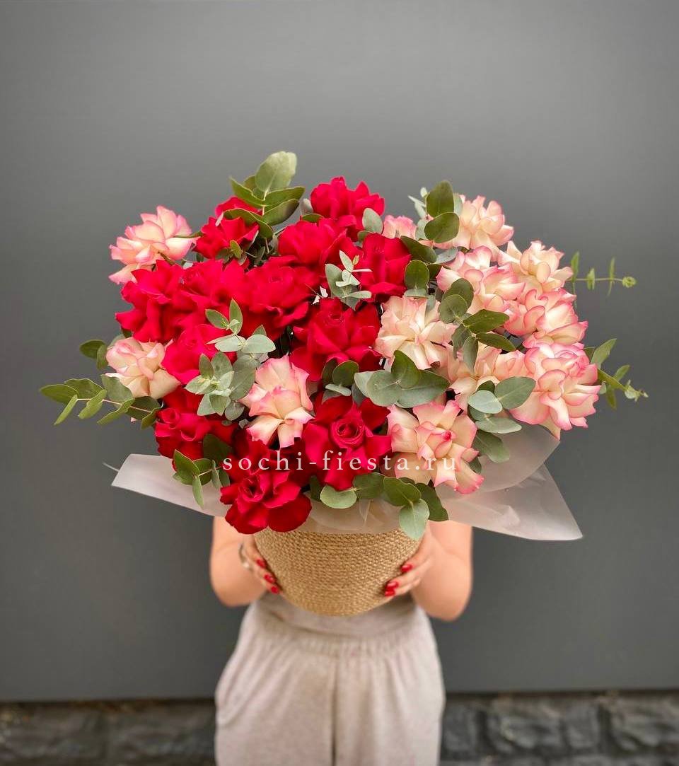 Французские розы теплого оттенка раскрываются в окружении эвкалипта и листьев Чико. Композиция в джутовом кашпо выглядит самодостаточно и гармонично вписывается в любое пространство.
