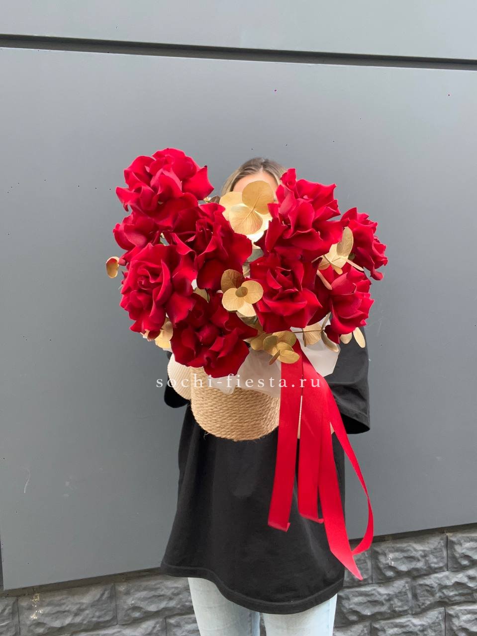гортензия, белые розы, диантус, бомбастик, эустома, лимониум, эвкалипт, бокс 25 в джуте.