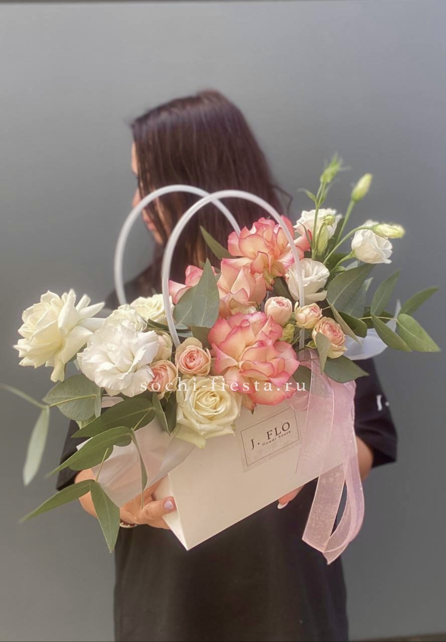 гортензия, розы, эустома, эвкалипт, диантус, лента, сумка.