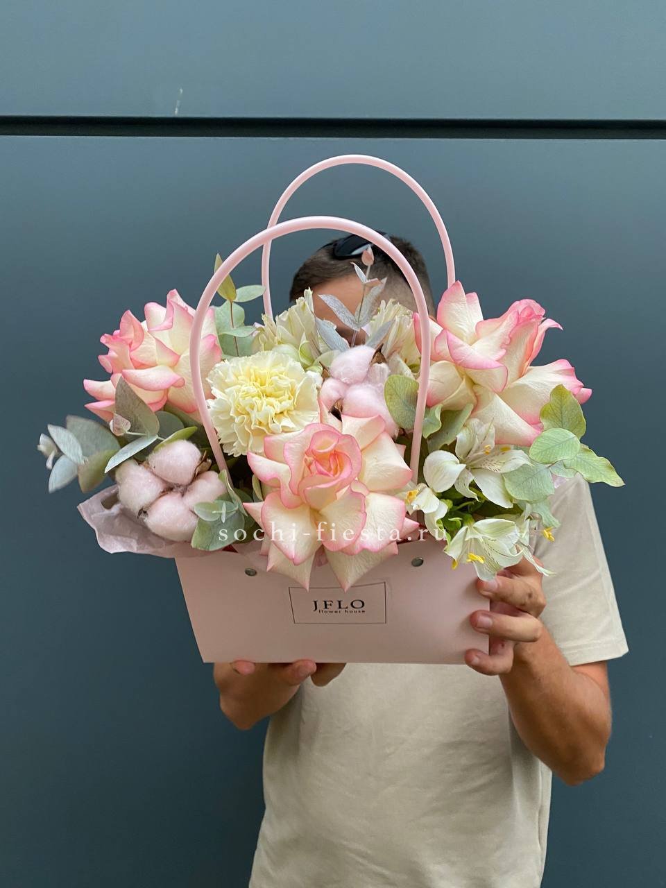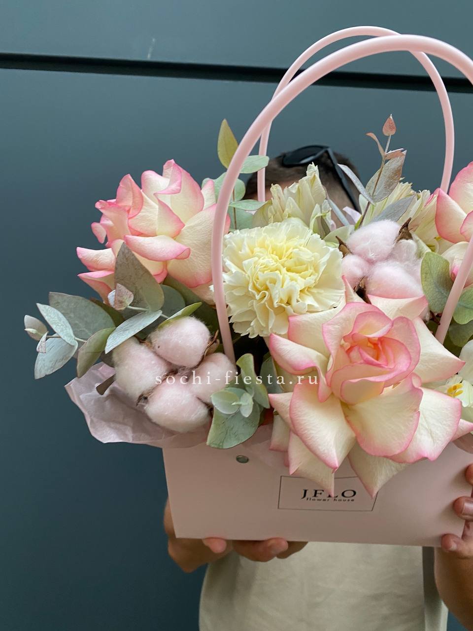 Голубая гортензия задаёт тон всей композиции, где хризантема и эустома создают объём, а хлопок с лагурусом добавляют воздушности. Сумочка вмещает насыщенную палитру без перегруженности.