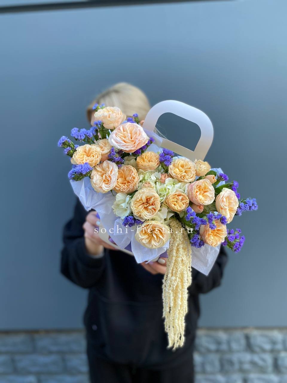 Голубая гортензия и статица задают основной тон, а кустовые розы разбавляют прохладную палитру теплыми нотами. Сумочка держит форму и выглядит собранно.