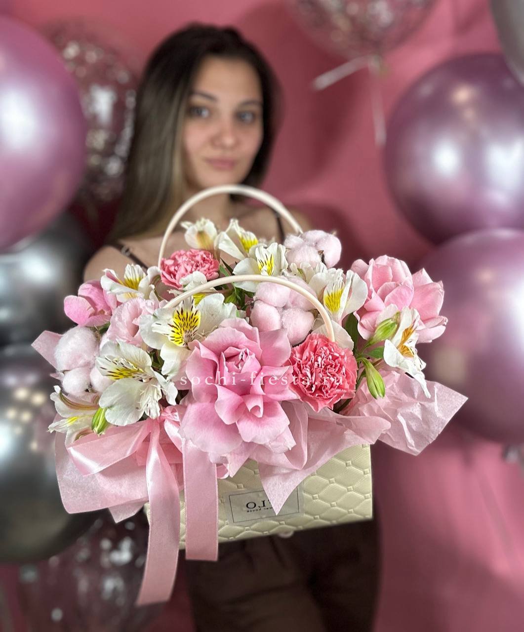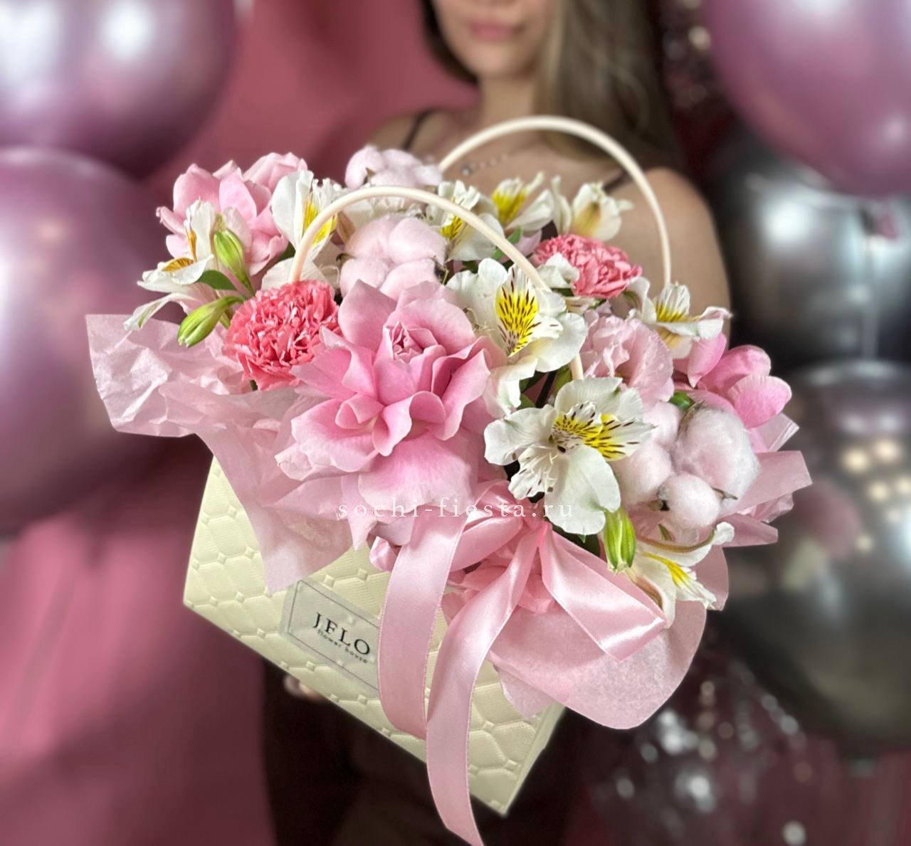 Воплощение изысканности и тренда! Эта стильная композиция в розовой сумочке объединяет в себе яркие цветовые акценты и современный флористический дизайн. Она идеально подойдет для модного образа или в качестве креативного подарка для ценителей необычных решений. Безупречный вкус в каждой детали.