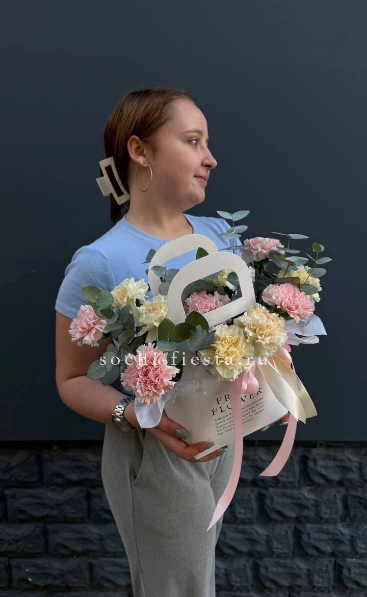 Французские розы собраны в аккуратную форму и помещены в сумочку. Компактная композиция легко помещается на столе или полке, сохраняя свежесть и опрятный вид.