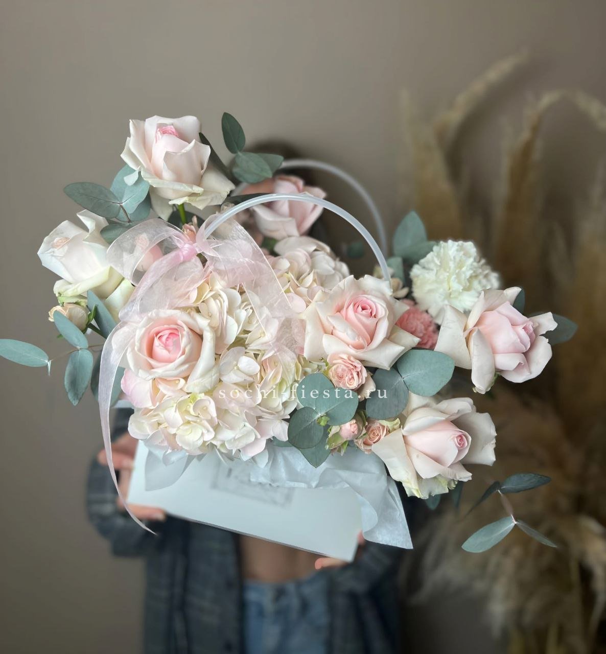 Миниатюрная композиция в удобной сумочке сочетает пышные головки хризантем с бархатистыми розами и воздушным диантусом. Веточки эвкалипта добавляют свежести, а компактная форма позволяет разместить цветы на рабочем столе или прикроватной тумбе.