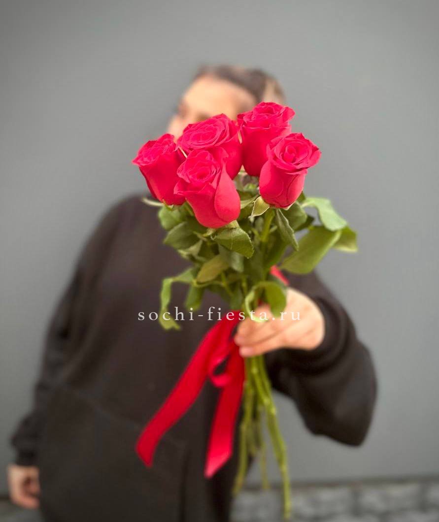 7 красных роз, эвкалипт, упаковка, лента. Данная цена доступна при единовременном заказе от 10 шт.