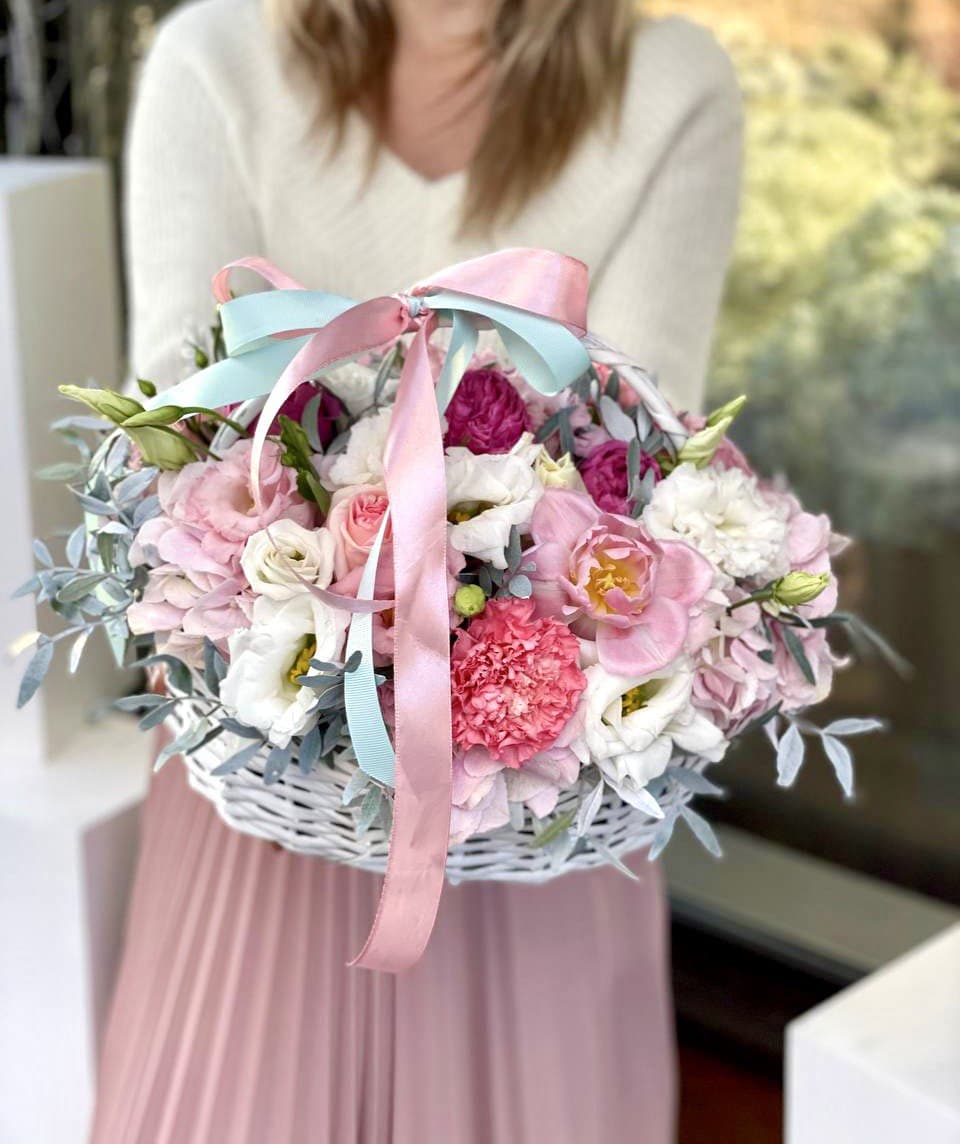 Корзина объединяет садовые розы с воздушной эустомой и яркими вспышками альстромерии. Ковыль добавляет лёгкости, а гортензия создаёт фактурный фон для всей композиции.