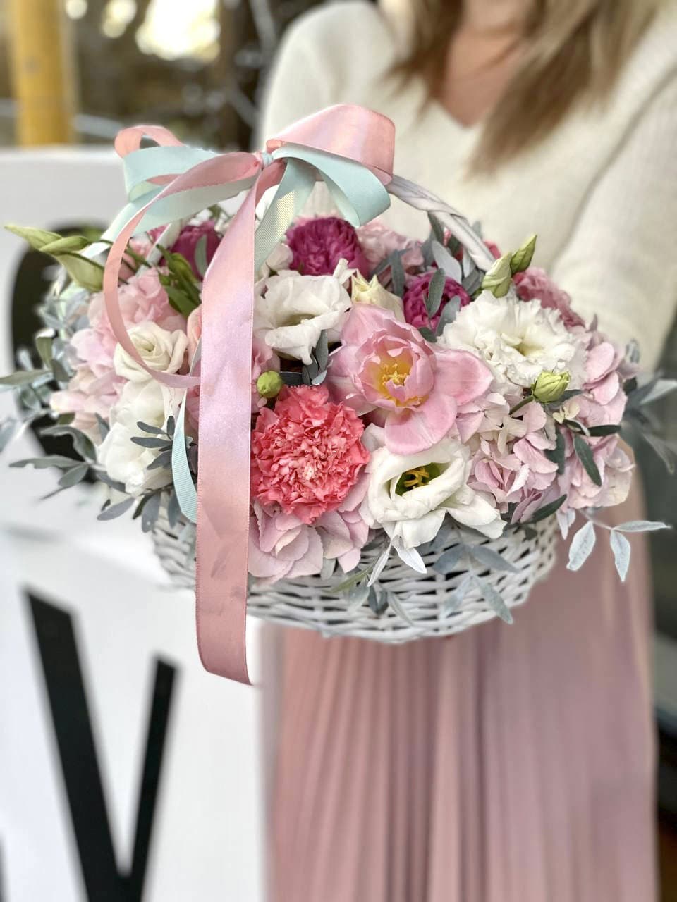 роза одноголовая, роза пионовидная, альстромерия, эустома, гортензия, ковыль, диантус, плетеная корзина.